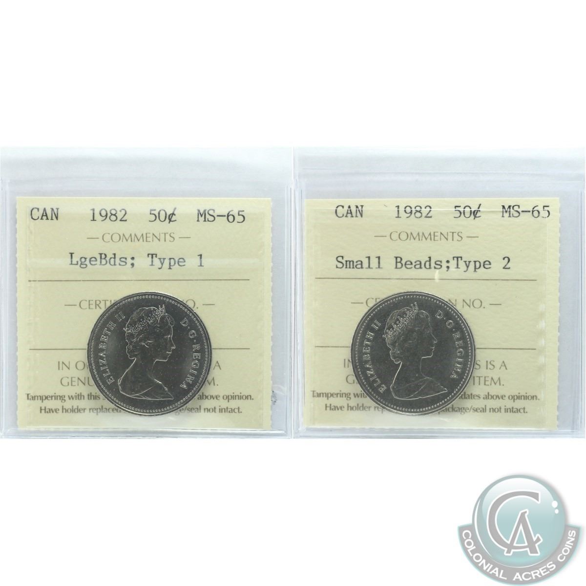 50-cent 1982 Small Beads Type 2 & 1982 Large Beads Type 1 ICCS Certified MS-65. 2pcs