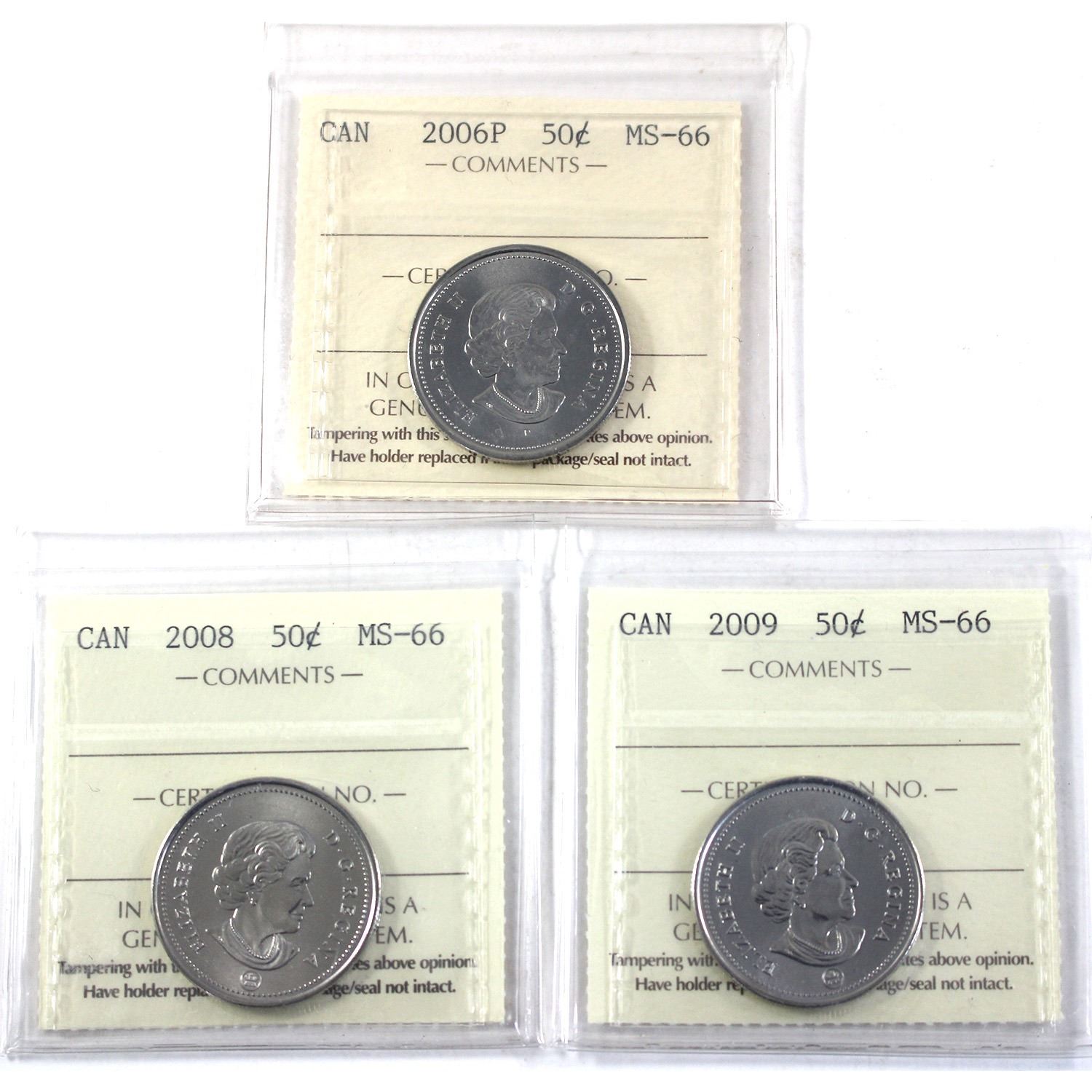 50-cent 2006P, 2008, & 2009 ICCS MS66. 3pcs.