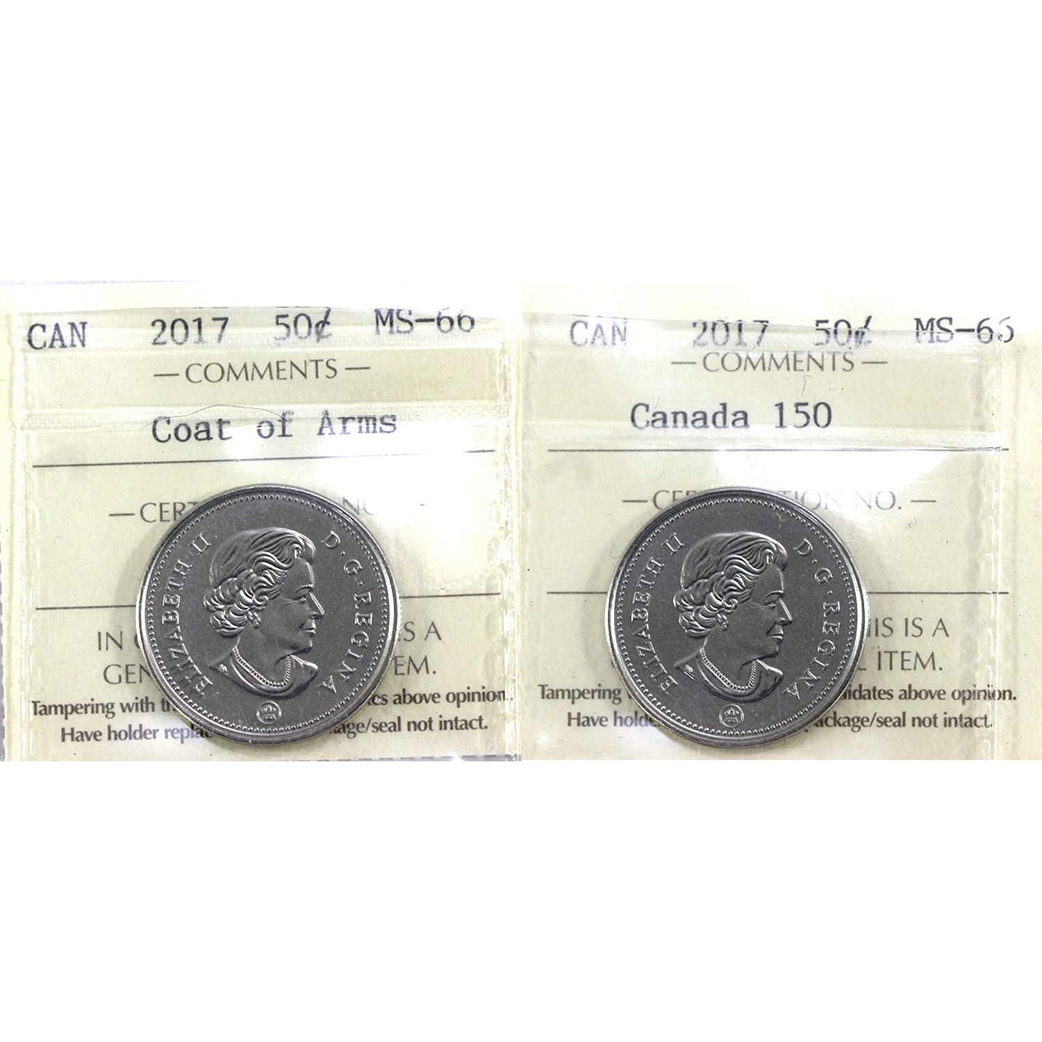 50-cent 2017 Canada 150 & Coat of Arms ICCS MS66. 2pcs