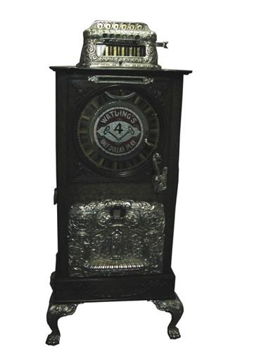 50 cent, "Watling" Chicago, Upright Slot Machine 4-Bit play on glass. This machine was purported to be originally used in Alaske during the Gold Rush and then moved to No. California where it was in play until the late 1940's....<BR><b>Due to laws regulating the sale of antique slot machines, I, as the seller, will not sell to members in the states of Alabama, Connecticut, Hawaii, Indiana, Nebraska, South Carolina, and Tennessee. Bids from members residing in any of these states will be cancelled.</b>