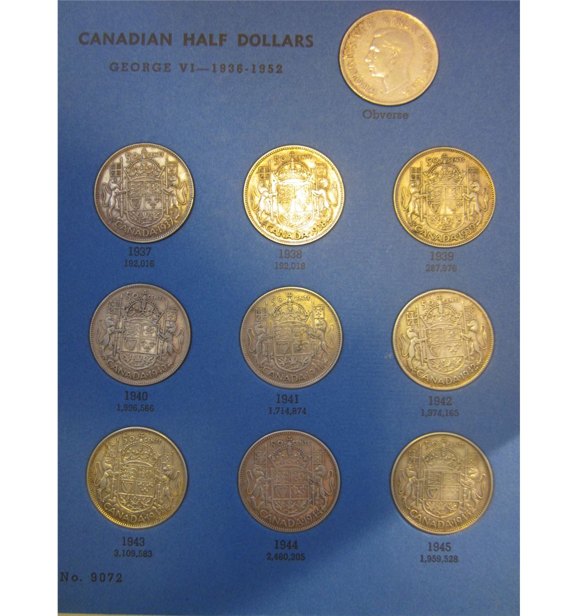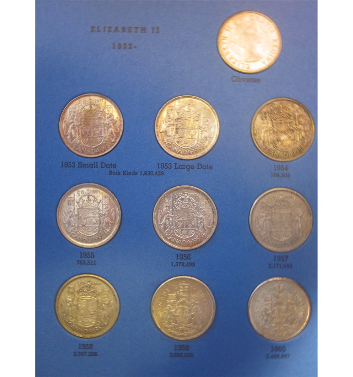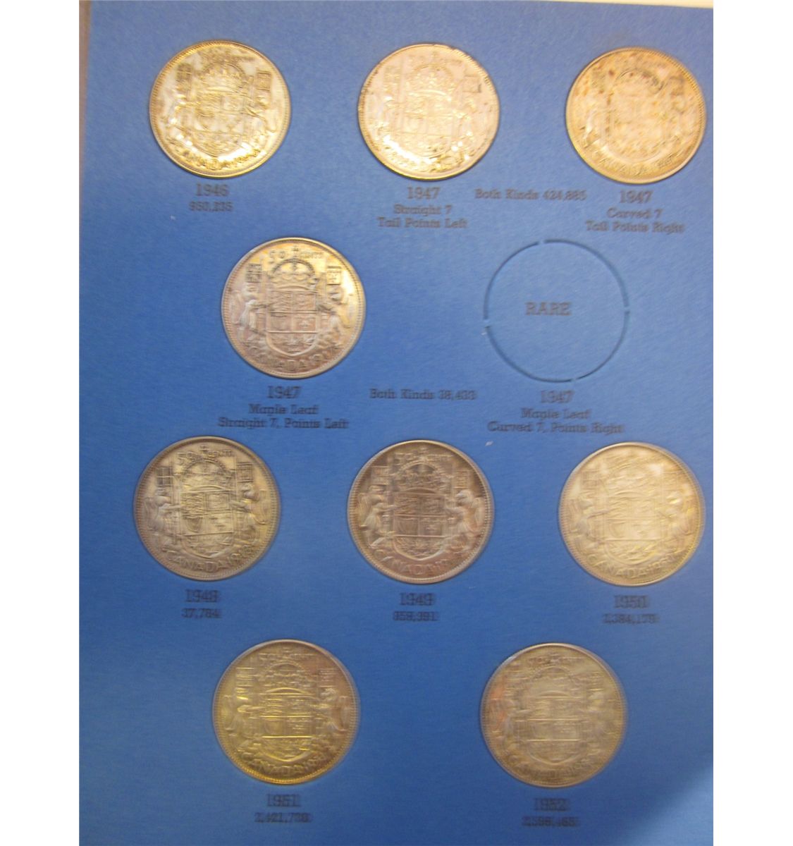 50 cents lot; 1937 to 1961 complete except the 1947 ML C7 with 2 extras for obverses in a blue Whitman album, VG to UNC, to be viewed for grade and variety. Lot of 29 coins.