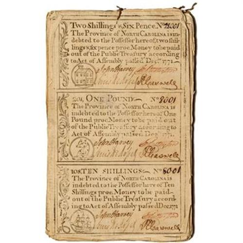 <b>50 colonial sheets.</b> This is a remarkable bundle of 50 three-note sheets stitched together at the top with old sewing thread! Uniface. The denominations on each are, from top to bottom: 2 shillings, 6 pence; 1 pound; and 10 shillings. The first has a vignette of a two-story building, the seond a seal with stars representing the Big Dipper constellation on its body, and the third, a three masted sailing ship. Issue of December 1771. Each has four clear bright signatures in red or sepia. A remarkable original bundle or pack of Colonial paper money from North Carolina.