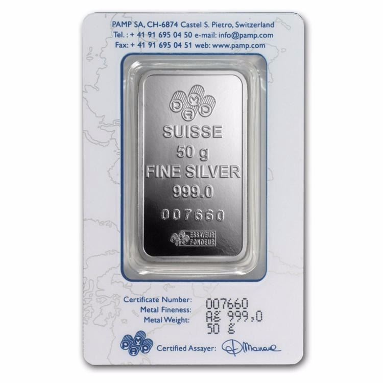 Year/N/AGrade/None Grade Service/Assay Card Denomination/50 grams Mint Mark/N/A Metal Content/1.6075 troy ozPurity/0.999Manufacturer/Pamp SuisseThickness/2.73mmDiameter/32x55mmInner Pack/25Outer Pack//OJL#63214