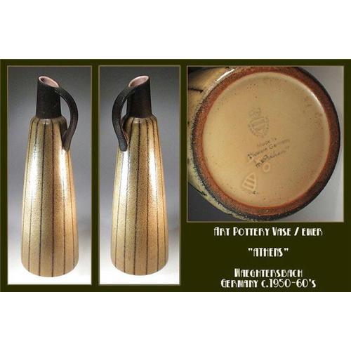 If you are REALLY interested in this item, please note that for Ebay Live Auction only bids at or above $180 will be successful and meet our reserve. Spectacular hand decorated Art Moderne pottery vase / ewer in excellent condition - no chips, cracks or repairs. Signed : Waeghtersbach, "ATHENS" 940 West Germany. Dimension : 11" high, Germany circa 1950-60's. Great addition to your collection or 50's decor!!!
