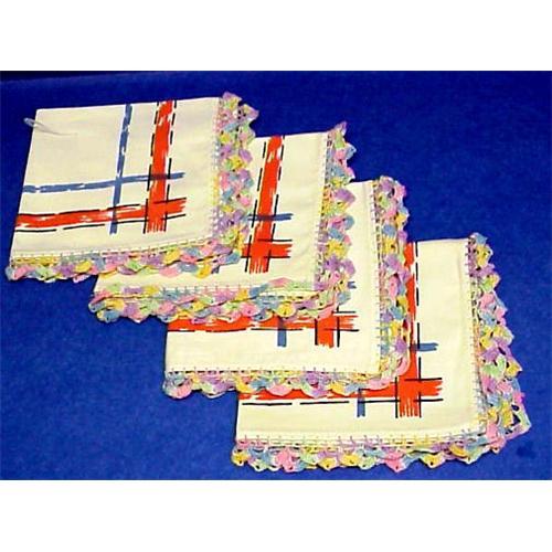 This is gorgeous set of 4 from 1950's, Love the colorful print in Art Deco style and most of all hand crocheted lace border in rainbow colors, VERY PRETTY! - This set is in very fine condition - Free of stains or holes - Each measures 11 3/4" x 12 1/2" ., US Buyer to pay 3.00 for shipping, We accept Paypal, Visa, Master Card or Money Order - 4 images - Thank You very much for looking
