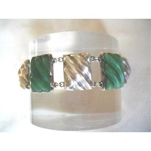 BURTON BROOK FARM ANTIQUES is pleased to present an outstanding 1950's heavy sterling grooved link bracelet with alternating carved & grooved green onyx links and a safety chain / the links are -1" tall ... bracelet is 7 1/2" long ... beautifully made and heavy. Stamped: Silver / Mexico / This is a gem.