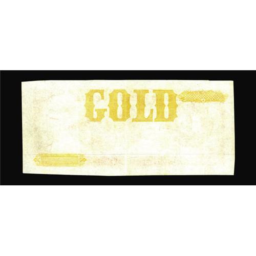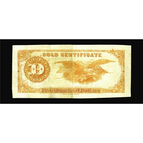 <B> Intriguing $500 1882 Gold Certificate Partial Printing.</B></I> We handled this unusual note once before, as part of our Taylor Family Sale in February of 2005. At that time we used the following description, "Acquired by the Taylor Family as an error note which was missing two of the three face printings. The front of the note has only the large "GOLD" at the top center and the two devices of the same color intended to be an underprint for the serial numbers. The back of the note is the normal reverse printing in its proper orange color. Although the possibility that this is an error is always there, we are not at all convinced. The margins are overly large for the issue, particularly at the top and bottom, and the note appears to be scissor cut all the way around. Our strong surmise is that this is a Proof, Progress Proof, test printing, or specimen of some type. The best argument in favor of this being an actual error is the fact that it is printed on paper which contains the red and blue security fibers, a paper which we have never seen used for anything other than regular issue notes. We can make no determination here as to the true status of this mysterious item, other than to say that it is definitely a Bureau produced piece, and suggest that bidders carefully inspect the item and come to their own conclusion. Due to the uncertain status of this note, it is being offered here without estimate and without a return privilege, and its sale will be considered final." We will repeat the same caveat here, and point out that in its last trip to the auction block in 2005 the note realized $9,200.