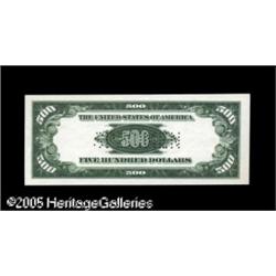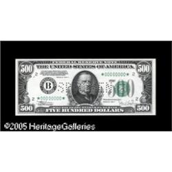 <B>$500 1934C Specimen Set. Superb Gem New.</B></I> The first pair from an incredible high denomination set. Each of the notes is uniface and on medium card as with the previous set, but in this instance, the straight zero serial numbers have stars on each end rather than the block and district letters of the previous set. All four sets are from the New York District, and all four sets share the tan "SPECIMEN NON NEGOTIABLE" print on their blank backs as well as the hole punched "SPECIMEN" through their centers. All four sets are utterly flawless save for minor glue stains on their blank backs. 2 notes Lot:15573