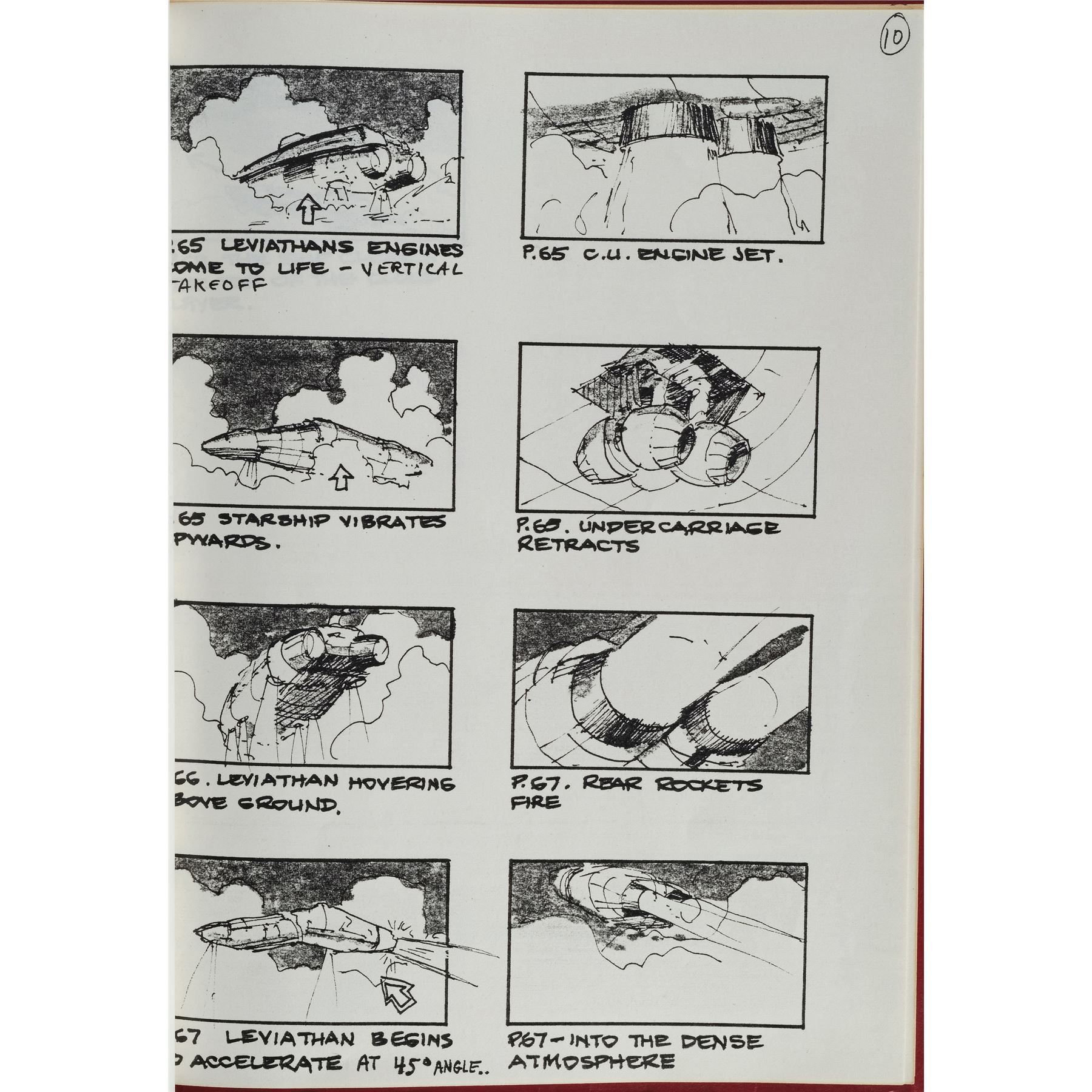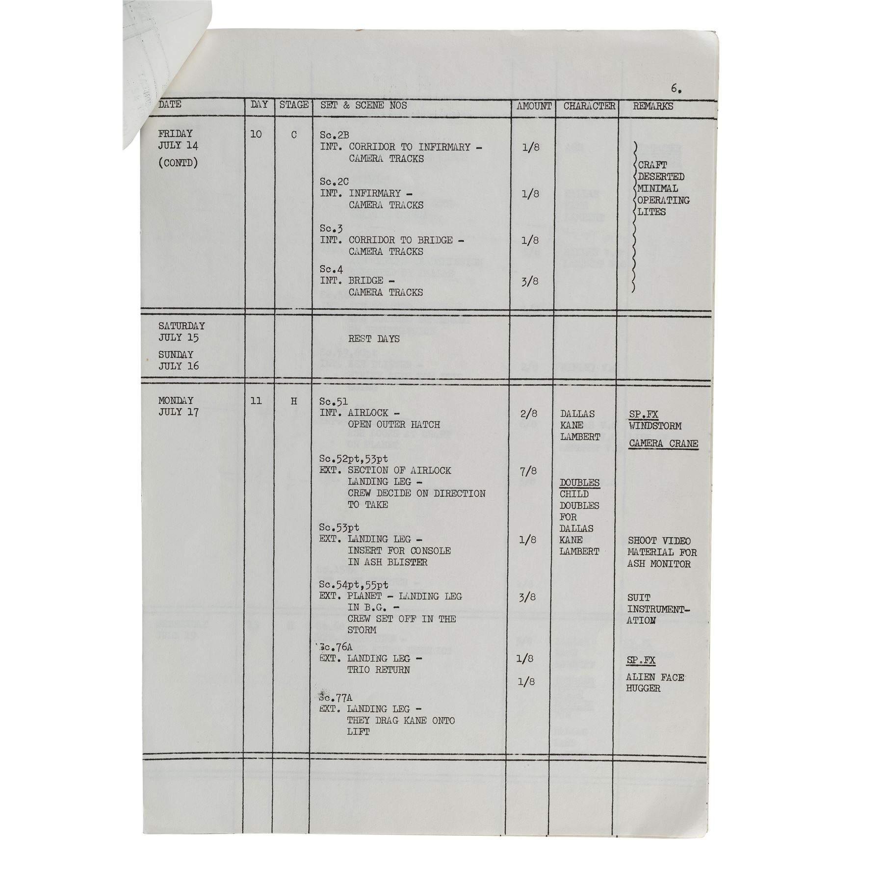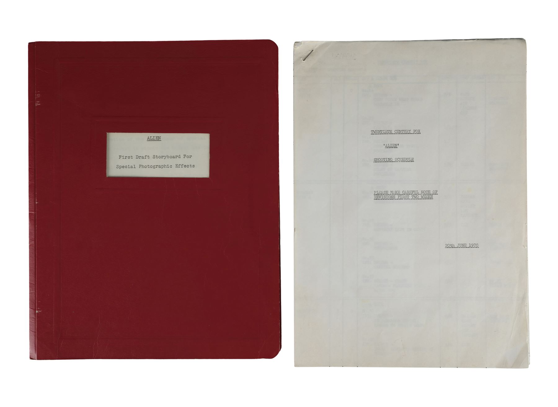 ALIEN (1979) - First Draft Printed Storyboard Artwork Portfolio and Production Schedule - A first draft printed storyboard artwork portfolio and a production schedule from Ridley Scott's Alien. Based on the script created by Dan O'Bannon and John Clark, this first draft storyboard features 30 pages of printed illustrations by Chris Foss and Ron Cobb for the special photographic effects. The storyboard comes in a red portfolio folder with a clear cellophane window. Included with this lot is a 25-page shooting schedule dated June 20, 1978. This lot exhibits discoloration and edge wear. Dimensions: (largest) 8.5" x 11.75" x 0.25" (21.75 cm x 29.25 cm x 0.75 cm)