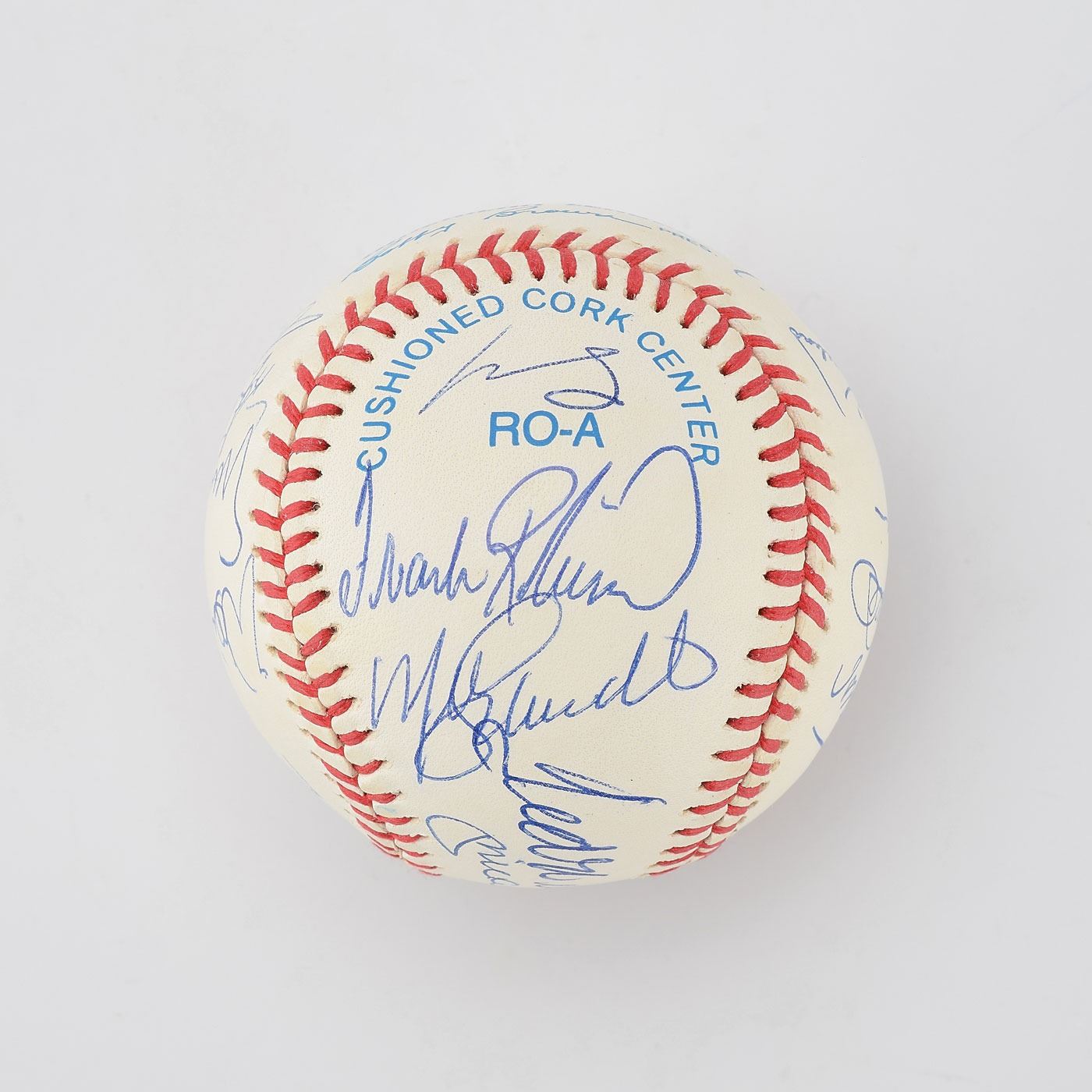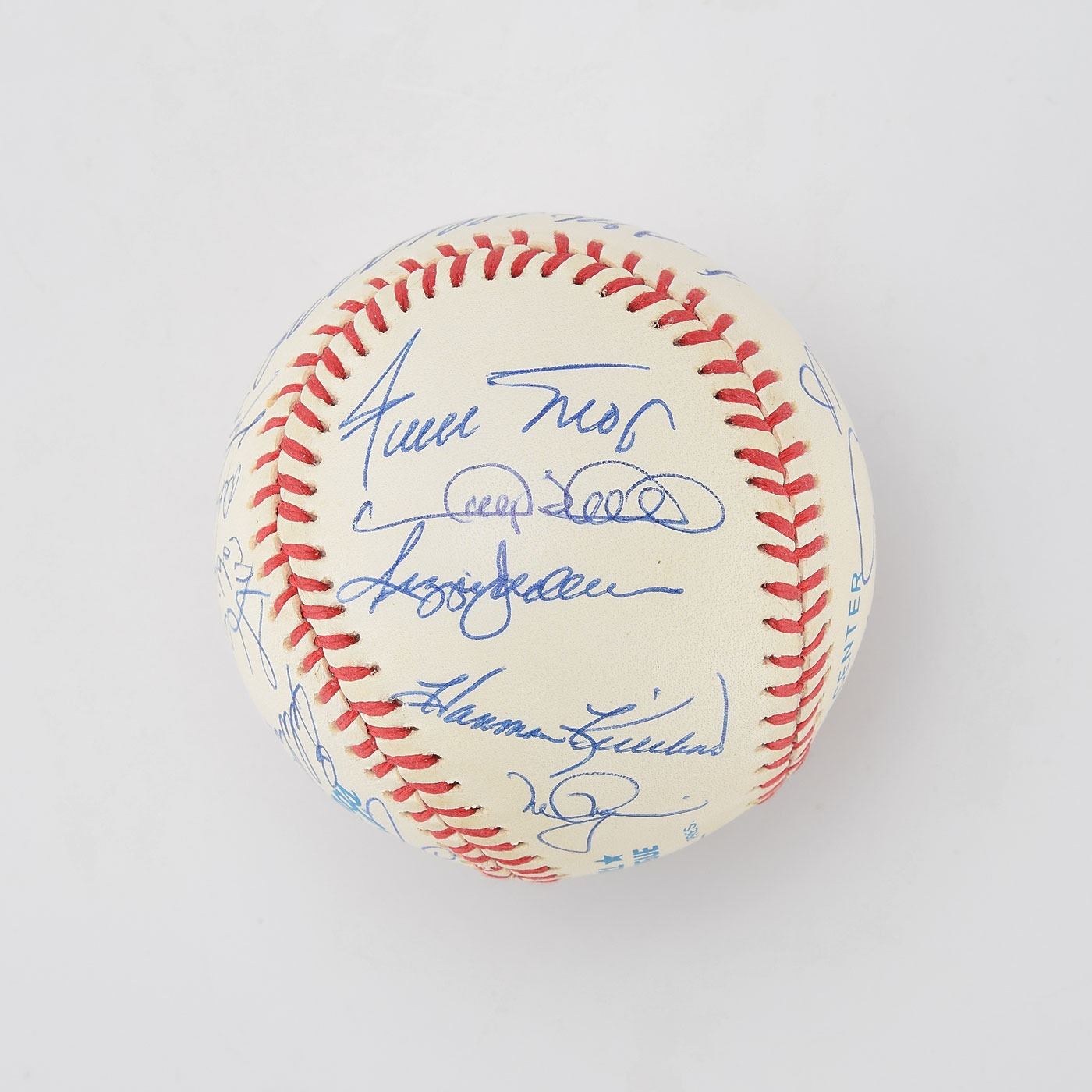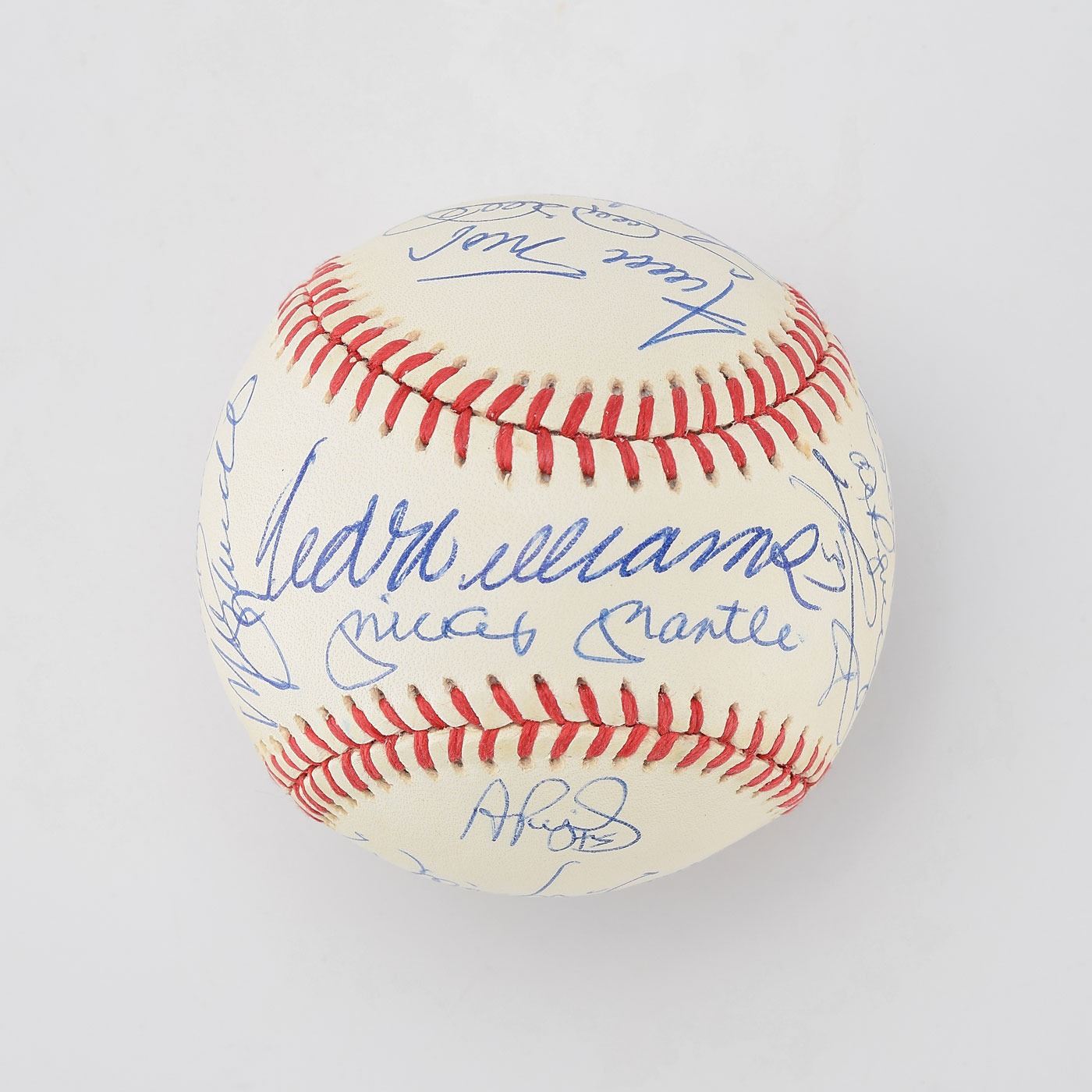One of the most privileged milestones in baseball is the 500 home run club. In this current age of offense, the 500 Home Run Club has increased dramatically over the years, with a total of 27 current members. This MINT condition OAL Brown baseball has been boldly signed in blue ink by an amazing total of 21 '500 Home Run Club' members, with only Barry Bonds, Ken Griffey, Jr. and Sammy Sosa among the living club members not on this ball. These signatures grade from ("9-10") with maybe 1 or 2 lesser. The sweet spot signatures of Ted Williams and Mickey Mantle might be the best examples we have ever seen on a ball of this type, with both signatures bold and perfectly centered.