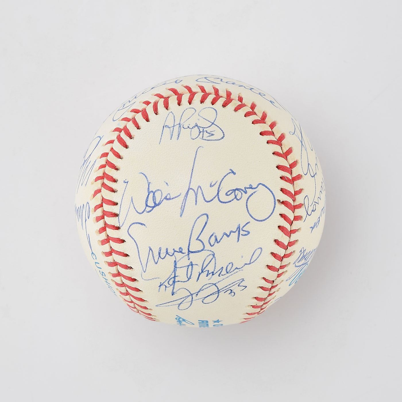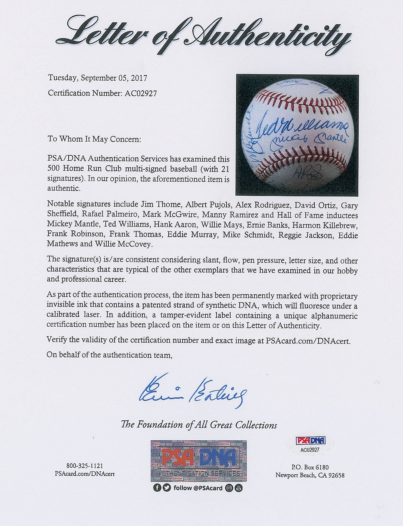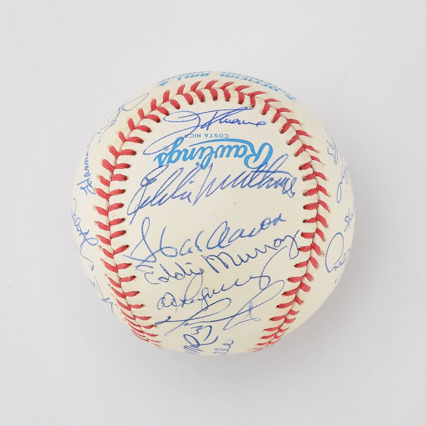 One of the most privileged milestones in baseball is the 500 home run club. In this current age of offense, the 500 Home Run Club has increased dramatically over the years, with a total of 27 current members. This MINT condition OAL Brown baseball has been boldly signed in blue ink by an amazing total of 21 '500 Home Run Club' members, with only Barry Bonds, Ken Griffey, Jr. and Sammy Sosa among the living club members not on this ball. These signatures grade from ("9-10") with maybe 1 or 2 lesser. The sweet spot signatures of Ted Williams and Mickey Mantle might be the best examples we have ever seen on a ball of this type, with both signatures bold and perfectly centered.