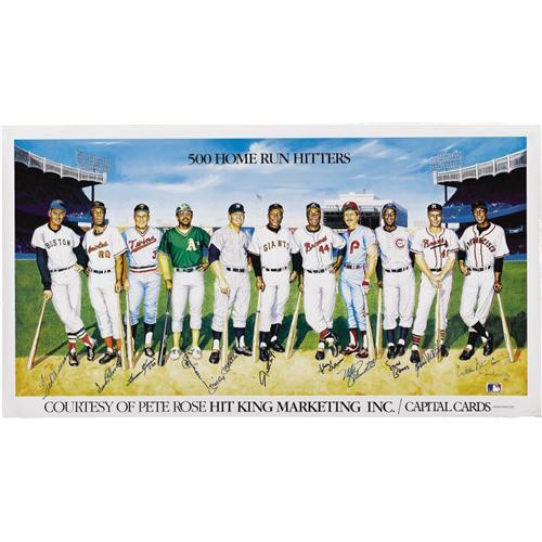 <B>500 Home Run Club Poster Signed by Eleven.</B></I> The classic 1988 Ron Lewis artwork picturing the Elite Eleven, each magically in his prime upon the Yankee Stadium diamond, offers the finest sharpie autographs you'll ever find from Williams, Robinson, Killebrew, Jackson, Mantle, Mays, Aaron, Schmidt, Banks, Mathews and McCovey. A bit of wear to the top and bottom borders of the poster will be rendered invisible upon matting and framing, leaving the piece to present in NRMT-MT condition. Total dimensions 21x38". <I>LOA from PSA/DNA. LOA from James Spence Authentication.</B></I><BR><BR><b>Shipping:</b> Flat Material, Large (<a target="_blank" href="http://www.heritageauctions.com/common/shipping.php">view shipping information</a>)