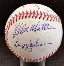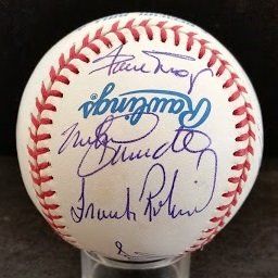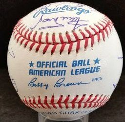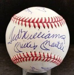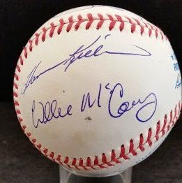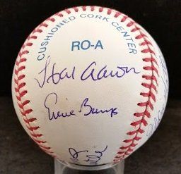 500 Home Run Club Signed Baseball Cert by The Score Board. This ball has been signed by Ted Williams, Mickey Mantle, Mike Schmidt, Ernie Banks, Hank Aaron, Frank Robinson, Reggie Jackson, Willie McCovey, Willie Mays, Eddie Mathews and Harmon Killebrew.