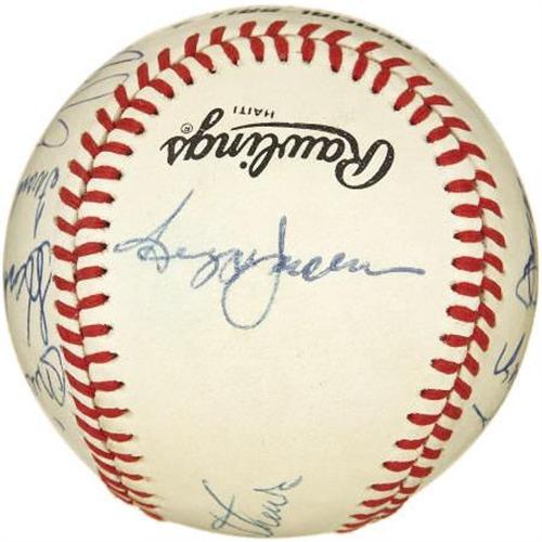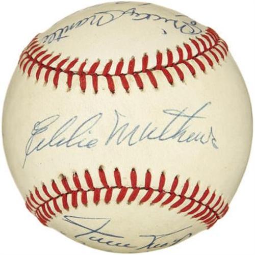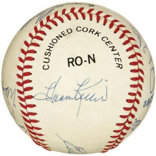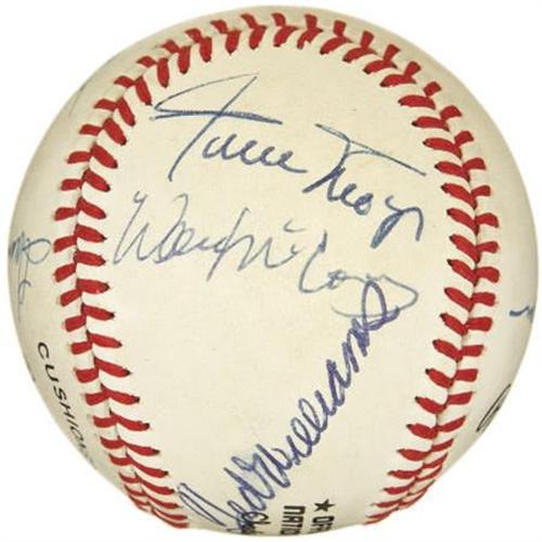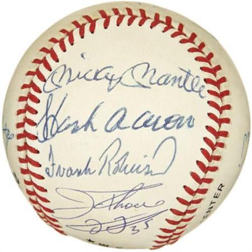 <B>500 Home Run Club Signed Baseball.</B></I> Nine of the "original eleven" are joined here by two new members of the elite club, with plenty of room left over for you to add guys like Griffey, A-Rod, Bonds, etc. The ONL (Feeney) ball features, in the boldest of blue fountain pen ink, Mantle, Williams, Aaron, Robinson, Mays, McCovey, Jackson, Mathews, Killebrew, Thomas and Thome. A fun project for the autograph seekers out there, as everyone you need but Ruth, Ott and Foxx are still available for signings. The ball itself remains clean and white, perfect for proud display. <I>LOA from PSA/DNA. LOA from James Spence Authentication.</B></I><BR><BR><b>Shipping:</b> Balls, Pucks, etc., Small (<a target="_blank" href="http://www.heritageauctions.com/common/shipping.php">view shipping information</a>)