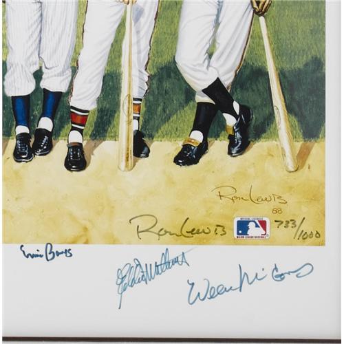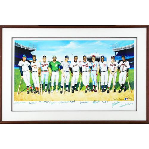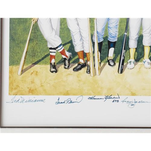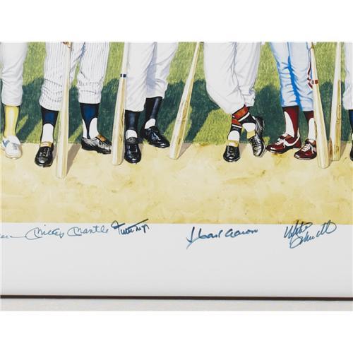 <B>500 Home Run Club Signed Lithograph.</B></I> While the instantly recognizable Ron Lewis artwork will bring to mind the more commonly seen signed posters typically offered on the collectibles market, we must make the very important distinction here between those posters and our offered lithograph, whose superior and costly nature limited the print run to a mere 1,000 copies. This piece is simply the most desirable of all production pieces autographed by the original eleven: Williams, Robinson, Killebrew, Jackson, Mantle, Mays, Aaron, Schmidt, Banks, Mathews and McCovey. Not only is the quality of the print itself a cut above the rest, but the positioning of the twelve perfect blue sharpie signatures (including the artist's) in the wide bottom border makes for a far more aesthetically pleasing piece than those posters signed vertically on the pants legs. Furthermore, the presentation of this 22x38" print with museum quality matting and framing (30x46" overall) truly makes this one a work of art. <I>LOA from PSA/DNA.</B></I> <BR><BR><B>Important notice:</B> Heritage usually auctions material at the rate of 200-250 lots per hour. On some occasions eBay Live bid software or the Internet may not be able to keep up with the pace of the auction. We recommend placing a realistic absentee bid now as insurance to avoid disappointment. Occasionally the auctioneer may eliminate or reject an eBay Live bid, and the auctioneer may also reopen a lot after the close of the eBay live bidding (usually because we missed an audience bid), and may reject your bid even if it shows you as the winning bidder. By bidding via eBay Live, you agree that Heritage may award the lot to another bidder at its sole discretion under the circumstances described above or any other reasonable circumstances. Since eBay bids are not shown to us until we open the lot on the floor, we treat those bids just like floor bids. In most cases the floor responds before the eBay bid is presented to us, due to Internet lag time, so for consistency we have made it a policy that floor bids are always considered first over tie eBay live bids. Also please note that all Heritage lots purchased through eBay Live carry a 22.5% Buyer's Premium. Please make sure you read the Terms and Conditions before you bid. This lot is being auctioned in conjunction with a live floor auction by Heritage Galleries & Auctioneers. All final auction and invoice information will be supplied by Heritage Galleries & Auctioneers, and all other information should be considered preliminary. Lot:19126 <BR><BR><B>Winning Notification and Billing:</B> After the FINAL session in this auction is complete, Heritage will send e-mail and snail mail invoices. This process normally takes several days. All final auction and invoice information will be supplied by Heritage Galleries & Auctioneers, and all other information should be considered preliminary. <BR><BR>This auction will be conducted on a live auction floor and over the Internet through eBay Live. If you choose to place an absentee bid, please take a moment to <font color='#0000ff'><u><a href='http://pages.ebay.com/liveauctions/help/before/laabsentee.html'>learn how eBay Live absentee bidding works</a></u></font><font color='#000000'>