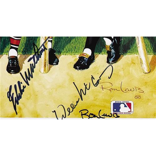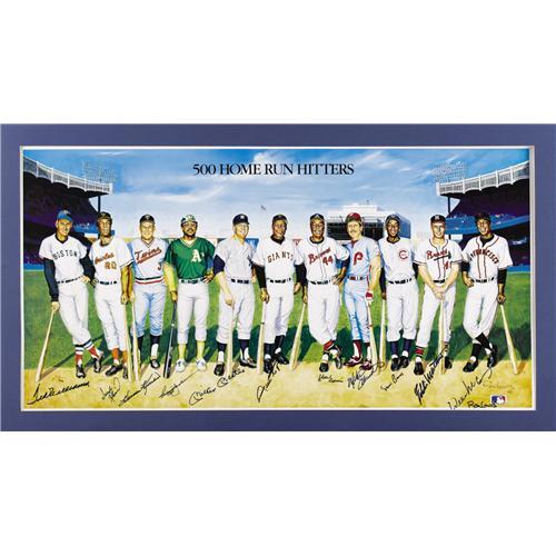 <B>500 Home Run Club Signed Poster by Ron Lewis.</B></I>  Celebrated sports artist Ron Lewis works his magic and brings the greatest sluggers since Ruth, Foxx and Ott together on the Yankee Stadium diamond, each in the prime of his career.  Running from left to right we find Williams, Robinson, Killebrew, Jackson, Mantle, Mays, Aaron, Schmidt, Banks, Mathews and McCovey.  Each has signed below his image in 10/10 blue sharpie, with Lewis bringing the autograph count to an even dozen.  The print measures 18x37" in size, and is matted to final dimensions of 22x40".  Poster itself is free of any flaws.  <I>LOA from PSA/DNA.</B></I> <BR><BR><B>Important notice:</B> Heritage usually auctions material at the rate of 200-250 lots per hour. On some occasions eBay Live bid software or the Internet may not be able to keep up with the pace of the auction. We recommend placing a realistic absentee bid now as insurance to avoid disappointment. Occasionally the auctioneer may eliminate or reject an eBay Live bid, and the auctioneer may also reopen a lot after the close of the eBay live bidding (usually because we missed an audience bid), and may reject your bid even if it shows you as the winning bidder. By bidding via eBay Live, you agree that Heritage may award the lot to another bidder at its sole discretion under the circumstances described above or any other reasonable circumstances. Since eBay bids are not shown to us until we open the lot on the floor, we treat those bids just like floor bids. In most cases the floor responds before the eBay bid is presented to us, due to Internet lag time, so for consistency we have made it a policy that floor bids are always considered first over tie eBay live bids. Also please note that all Heritage lots purchased through eBay Live carry a 22.5% Buyer's Premium. Please make sure you read the Terms and Conditions before you bid. This lot is being auctioned in conjunction with a live floor auction by Heritage Galleries & Auctioneers. All final auction and invoice information will be supplied by Heritage Galleries & Auctioneers, and all other information should be considered preliminary. Lot:19125 <BR><BR><B>Winning Notification and Billing:</B> After the FINAL session in this auction is complete, Heritage will send e-mail and snail mail invoices. This process normally takes several days. All final auction and invoice information will be supplied by Heritage Galleries & Auctioneers, and all other information should be considered preliminary.  <BR><BR>This auction will be conducted on a live auction floor and over the Internet through eBay Live. If you choose to place an absentee bid, please take a moment to <font color='#0000ff'><u><a href='http://pages.ebay.com/liveauctions/help/before/laabsentee.html'>learn how eBay Live absentee bidding works</a></u></font><font color='#000000'>