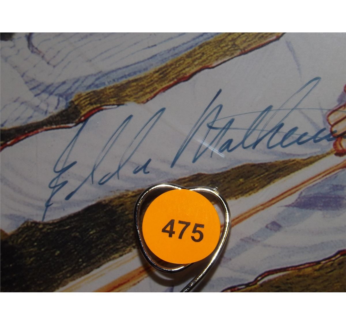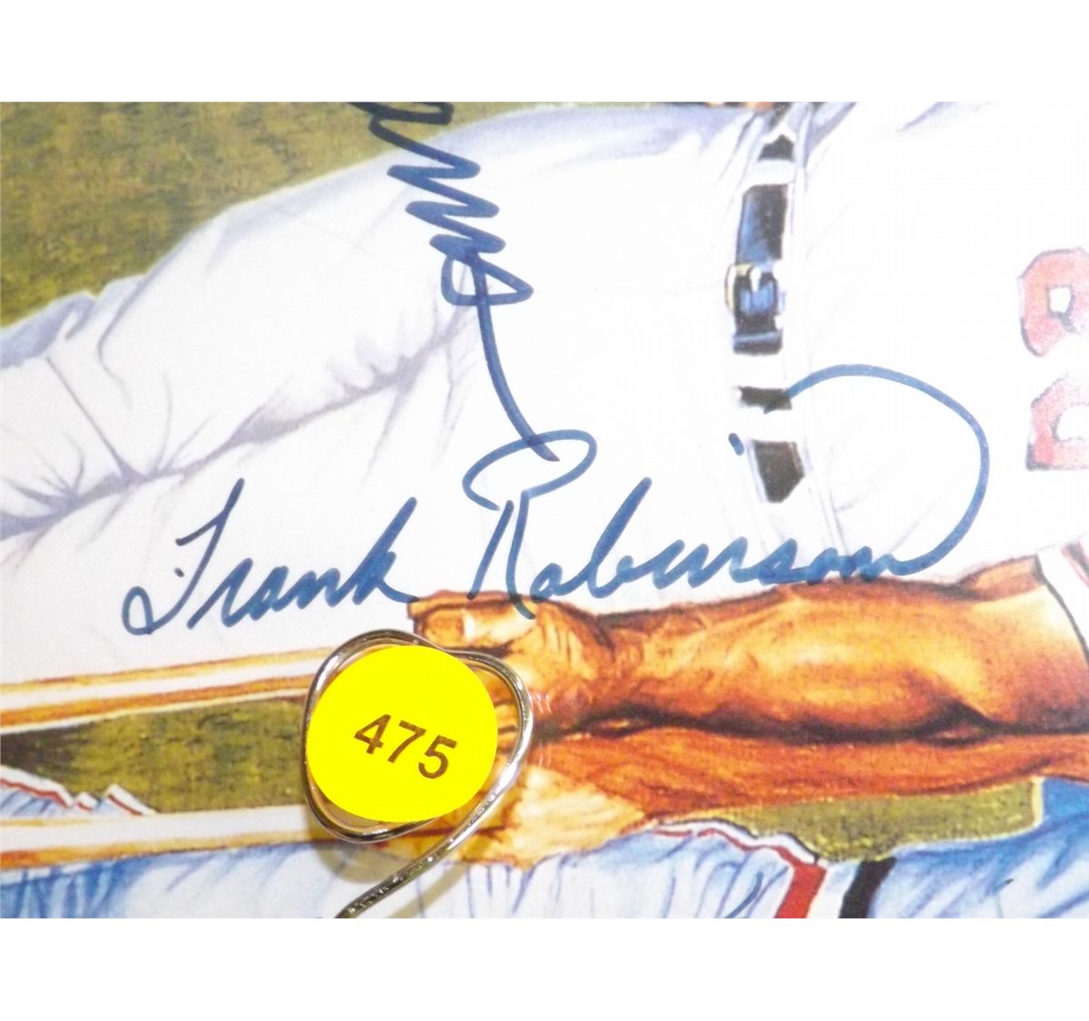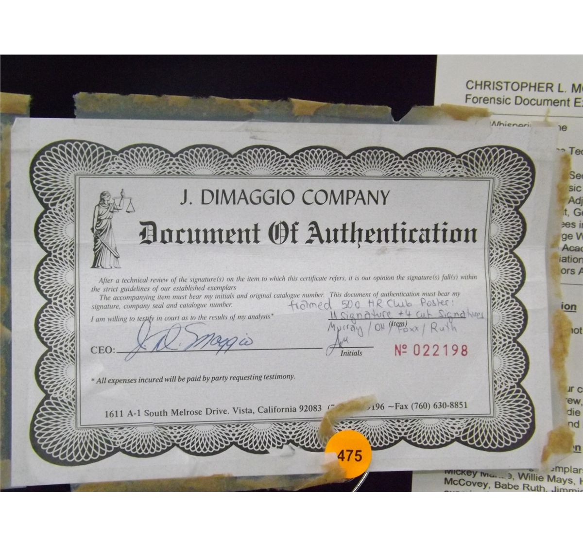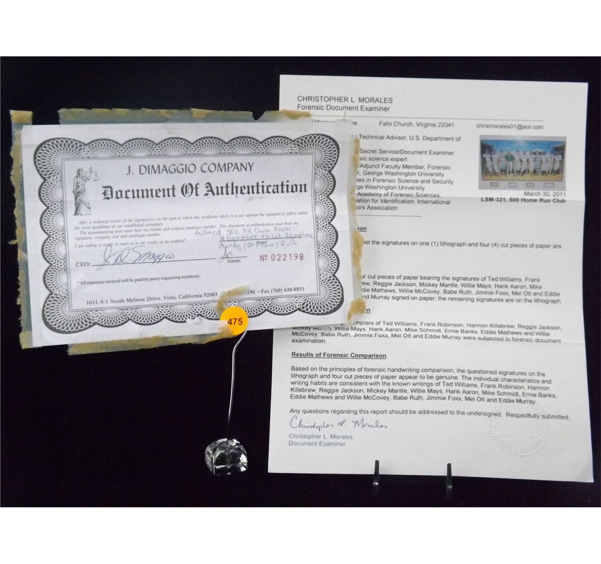 500 Home Run Hitters Autographed Lithograph. Framed and Matted Lithograph Signed by: Ted Williams, Frank Robinson, Harmon Killebrew, Reggie Jackson, Mickey Mantle, Willie Mays, Hank Aaron, Mike Schmidt, Ernie Banks, Eddie Mathews and Willie McCovey. There are also Die-Cut Signatures Below the Picture, by Babe Ruth, Jimmie Foxx, Mel Ott and Eddie Murray. Appraised or estimated retail value $8000. COAs by J. DiMaggio Co. and Christopher Morales. All Sales Final. Please see terms and conditions of auction.
