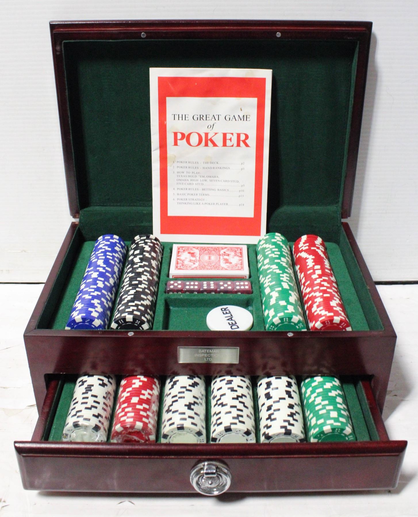 500 CHIPS, 5 DICE, DEALER BUTTON, RULES, 2 DRAWER WOOD CASE
