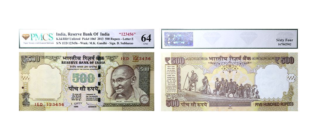 500 Rupees, 2013, Fancy Number, ladder, Old Gandhi Series, Signed by D. Subbarao, Inset E, Serial No. 1ED 123456, PMCS Graded 64 UNC, Very Rare.
