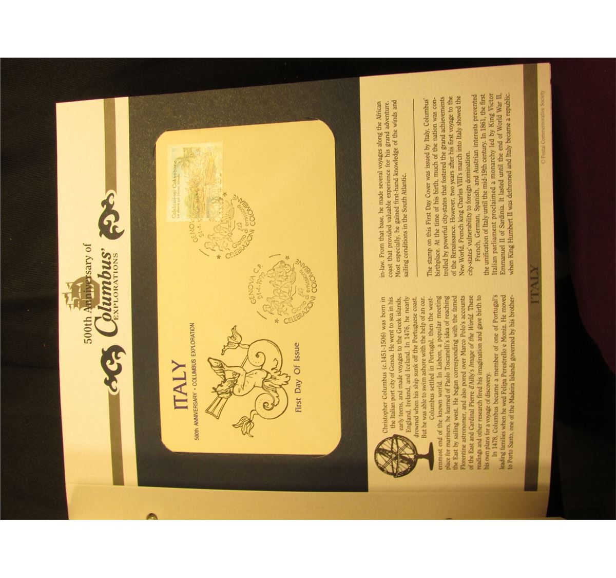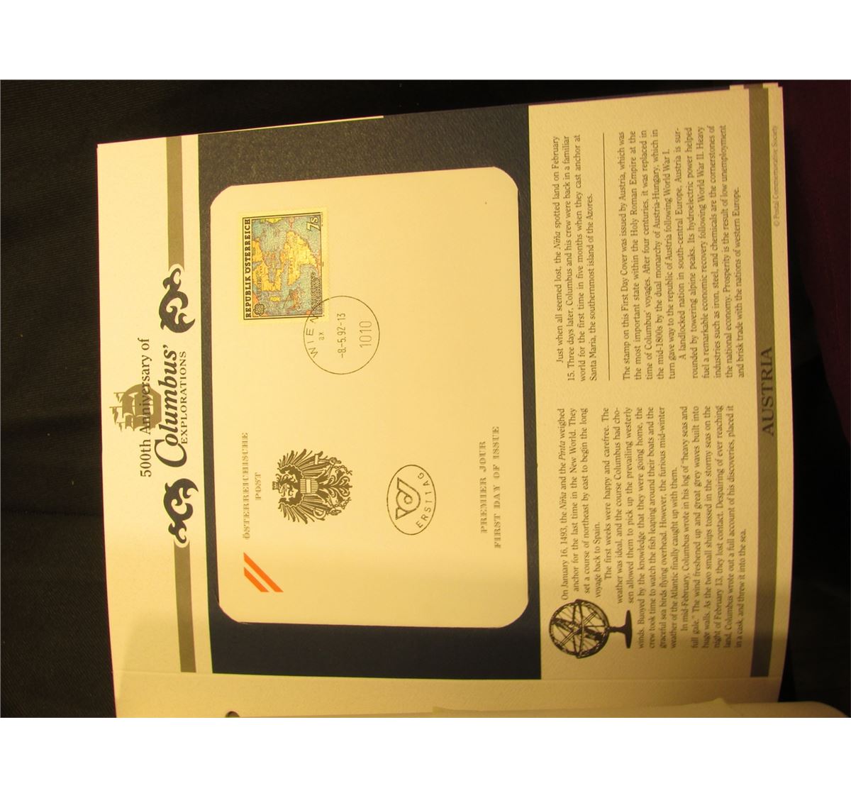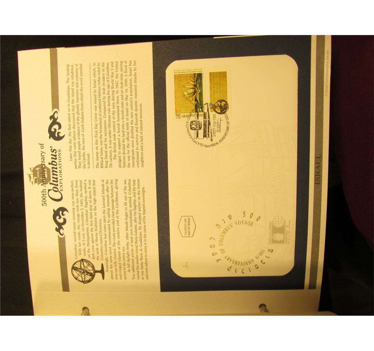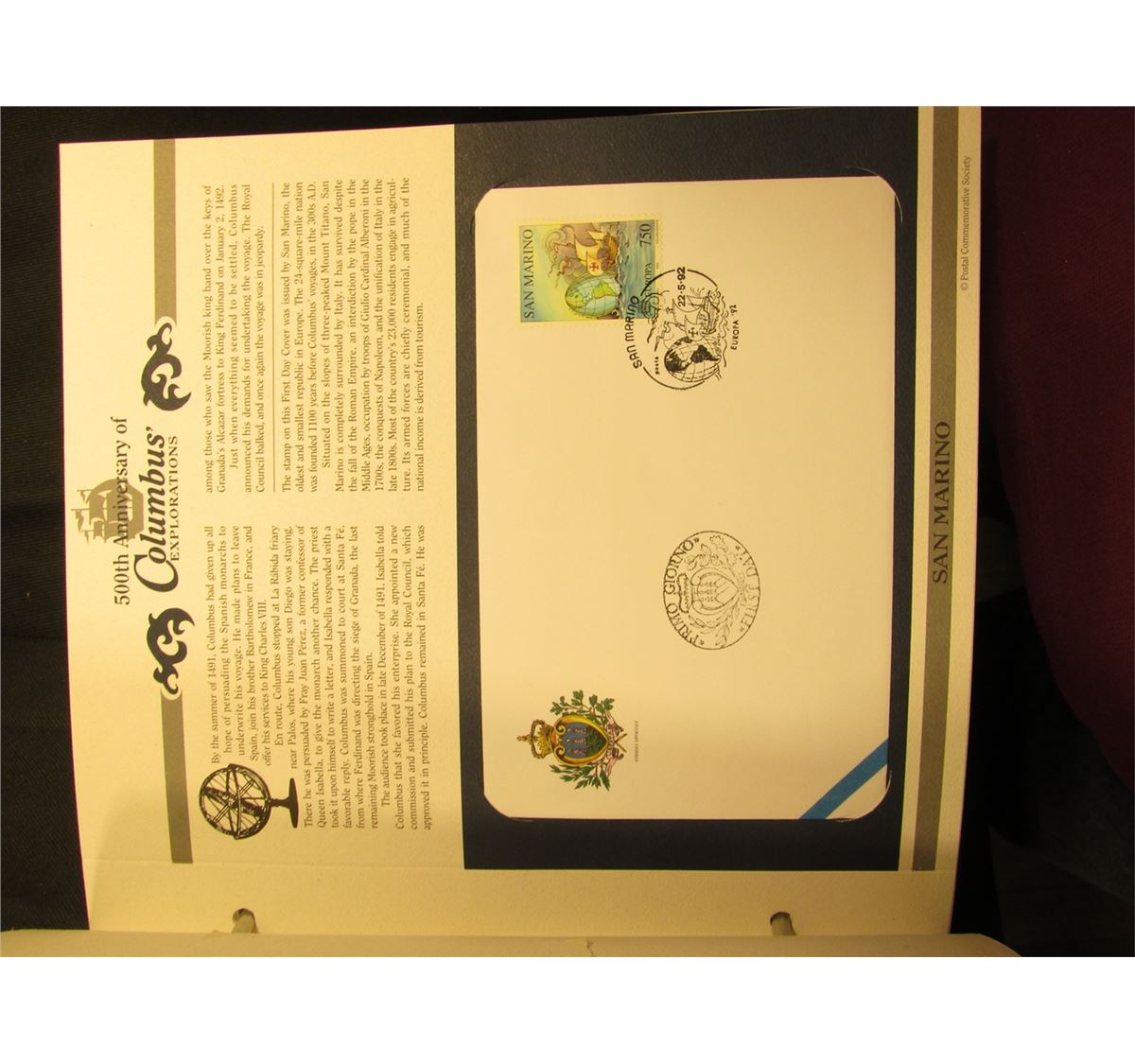 "500th Anniversay of Columbus' Explorations" Large Album from "Postal Commemorative Society" containing (80) "First Day of Issue" Covers with stamps and Postmarked in various countries, which related to Columbus' travels.