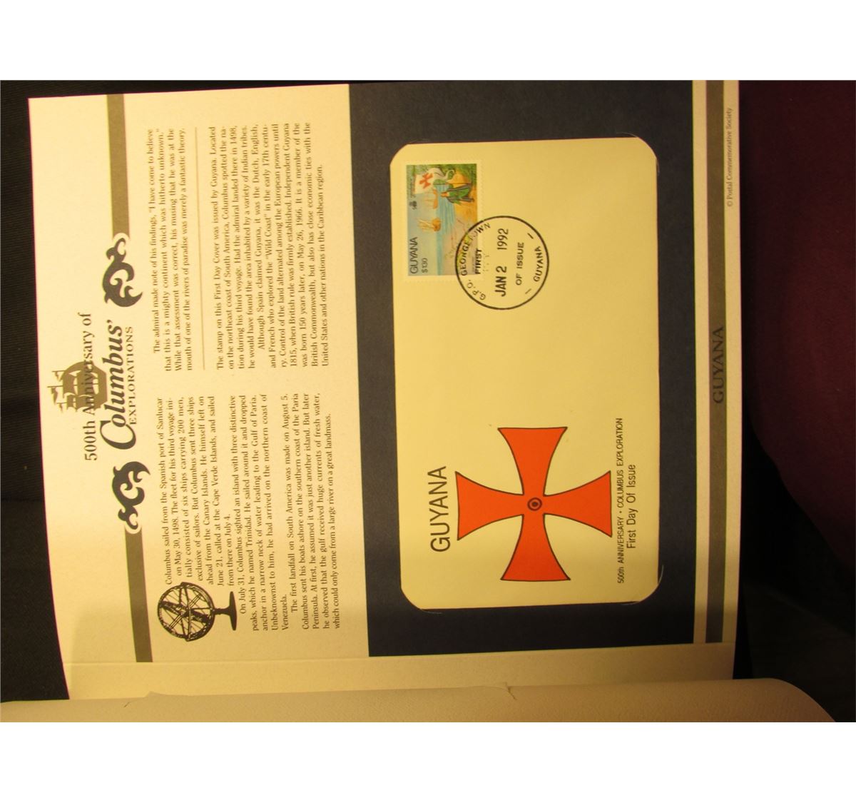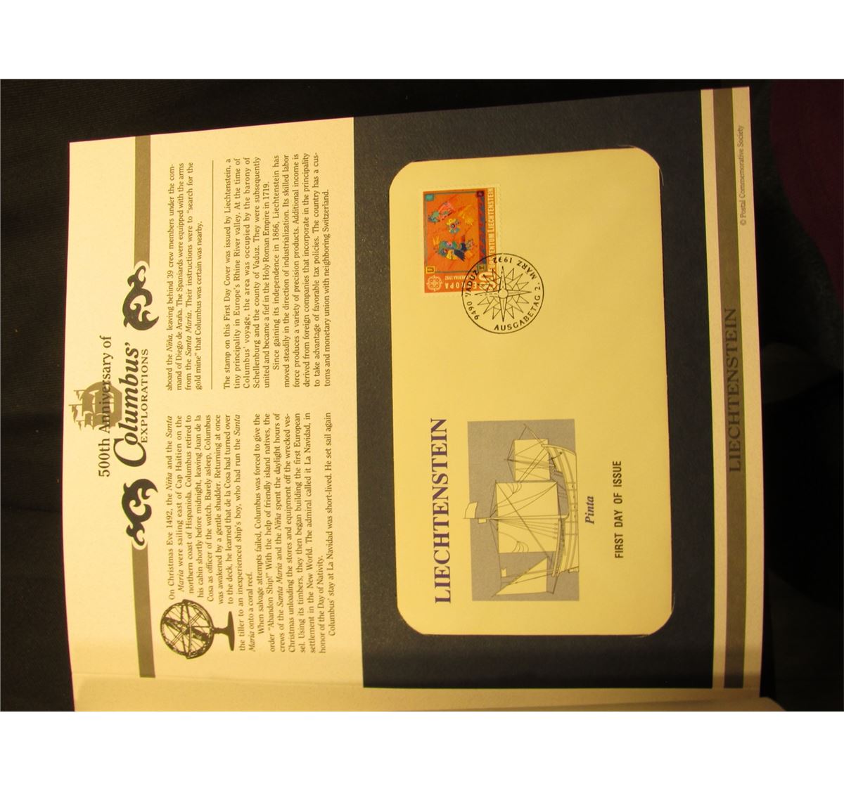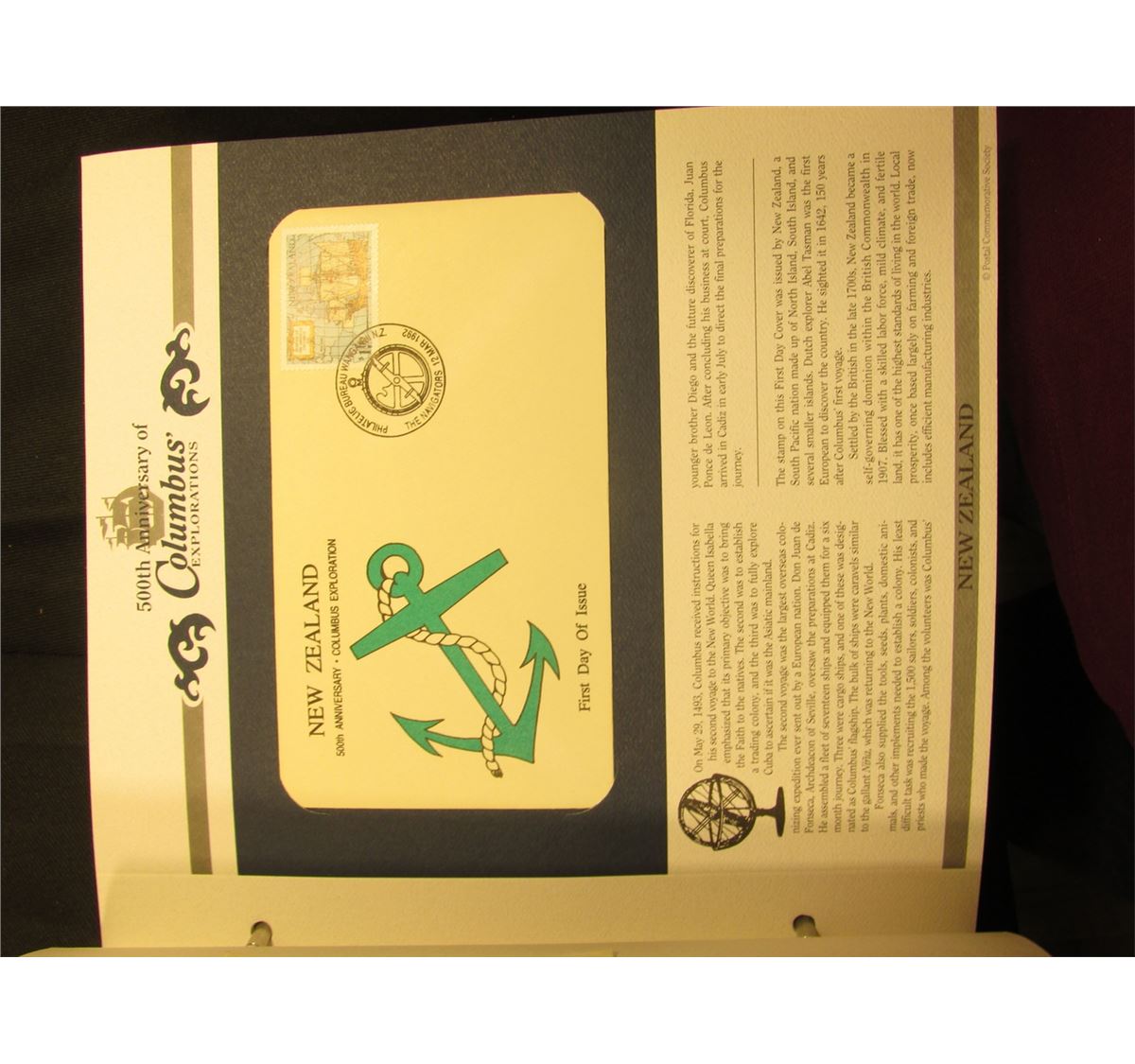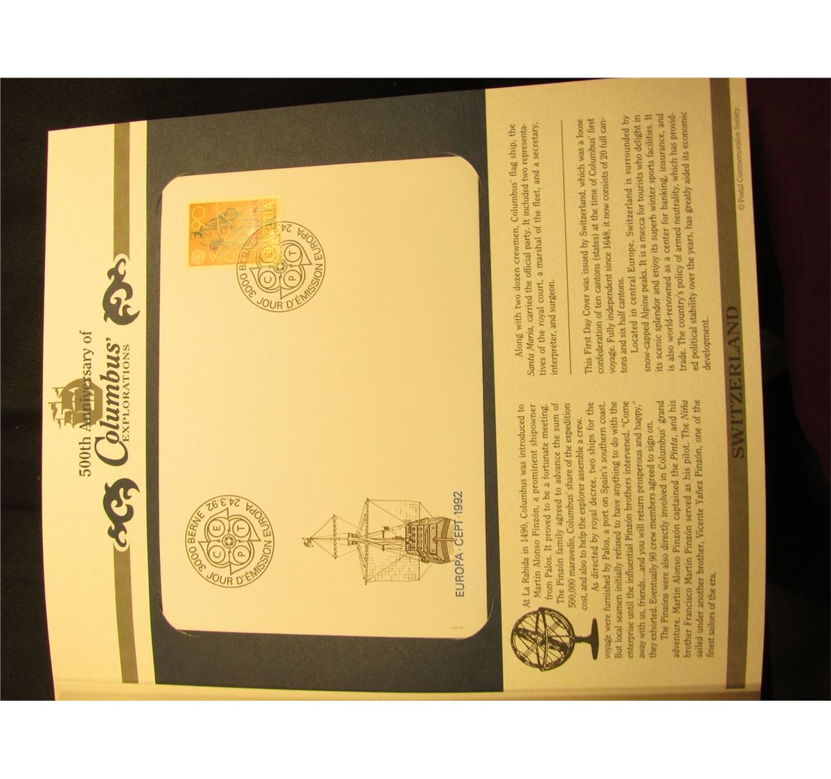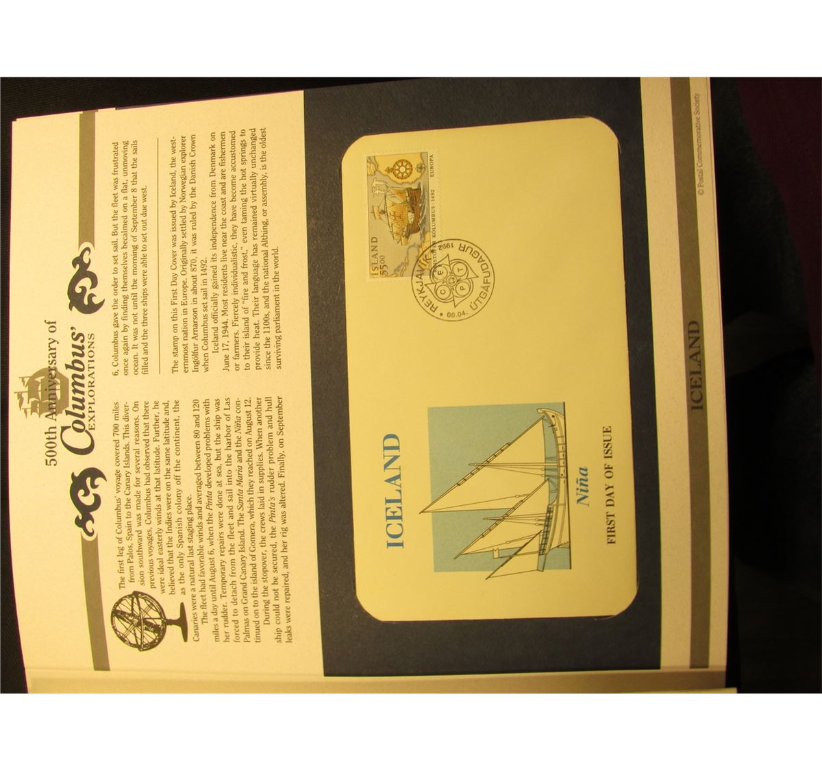 "500th Anniversay of Columbus' Explorations" Large Album from "Postal Commemorative Society" containing (80) "First Day of Issue" Covers with stamps and Postmarked in various countries, which related to Columbus' travels.