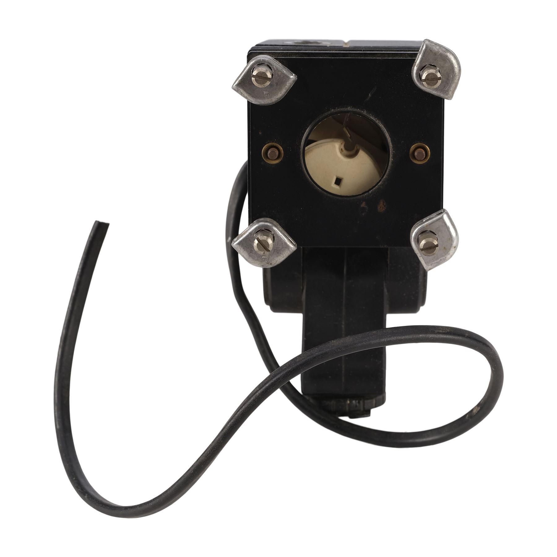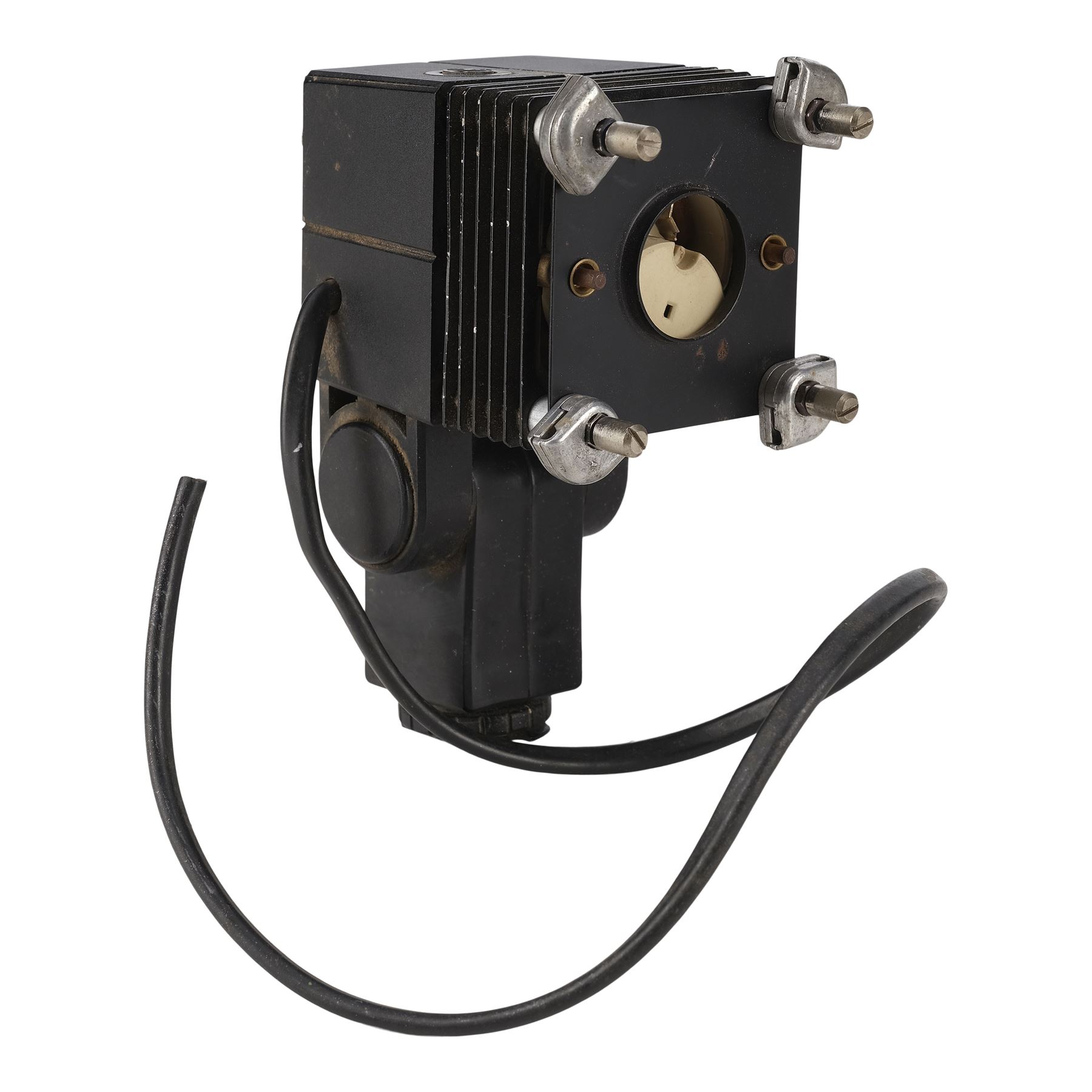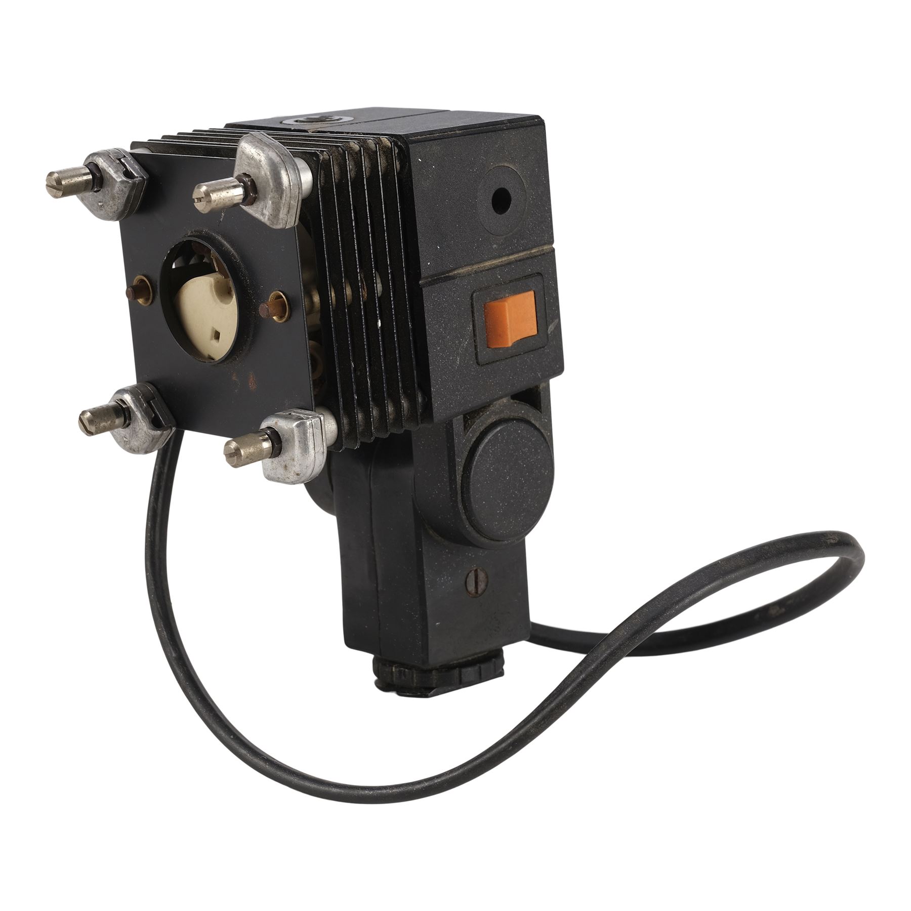 This base component for a Colonial Marine's shoulder lamp was created for production but ultimately unused in the final cut. Built from the base of a Reflecta 3002 video light, it features plastic and metal plates screwed together into a hinged box with electronics concealed on its interior and the Reflecta branding removed below the hinge for production. A rubber-wrapped power cord designed to illuminate a lightbulb set into the head via an orange switch extends from the opposite side of the switch. Following production, the cord was cut, rendering it nonfunctional. The lot exhibits rusting to its metal components, grime throughout from age and storage, and pitting from where the branding was removed. Dimensions: 5.5" x 2.5" x 3.5" (14 cm x 6.5 cm x 9 cm)