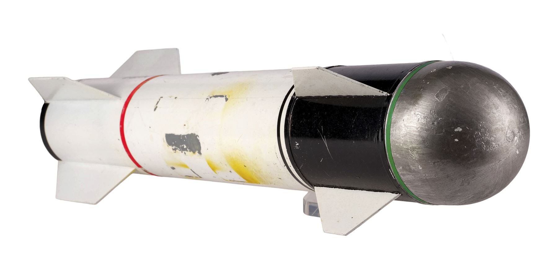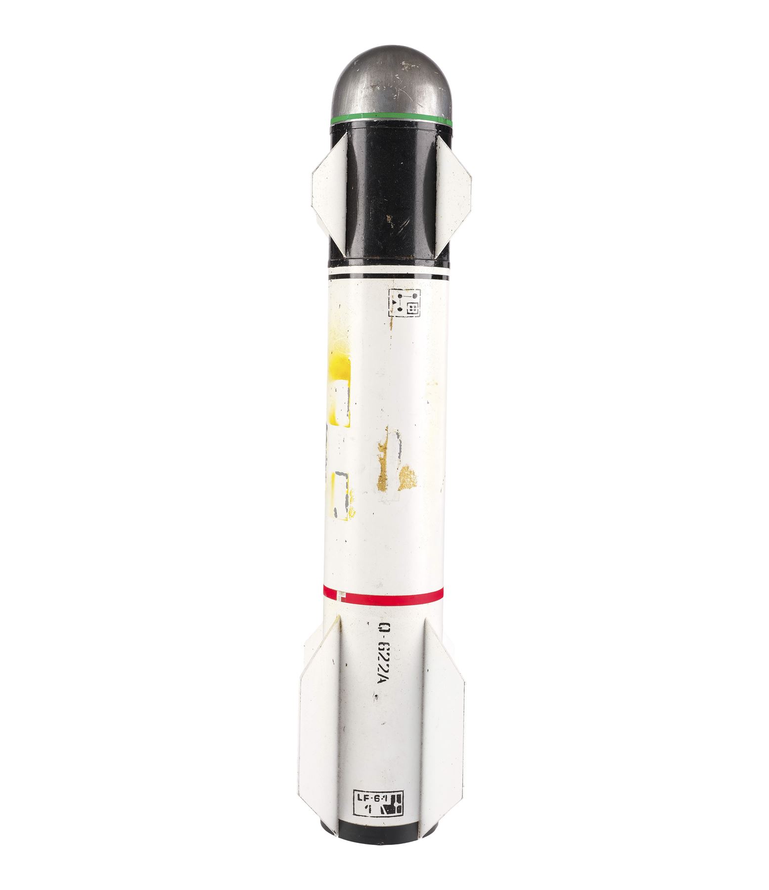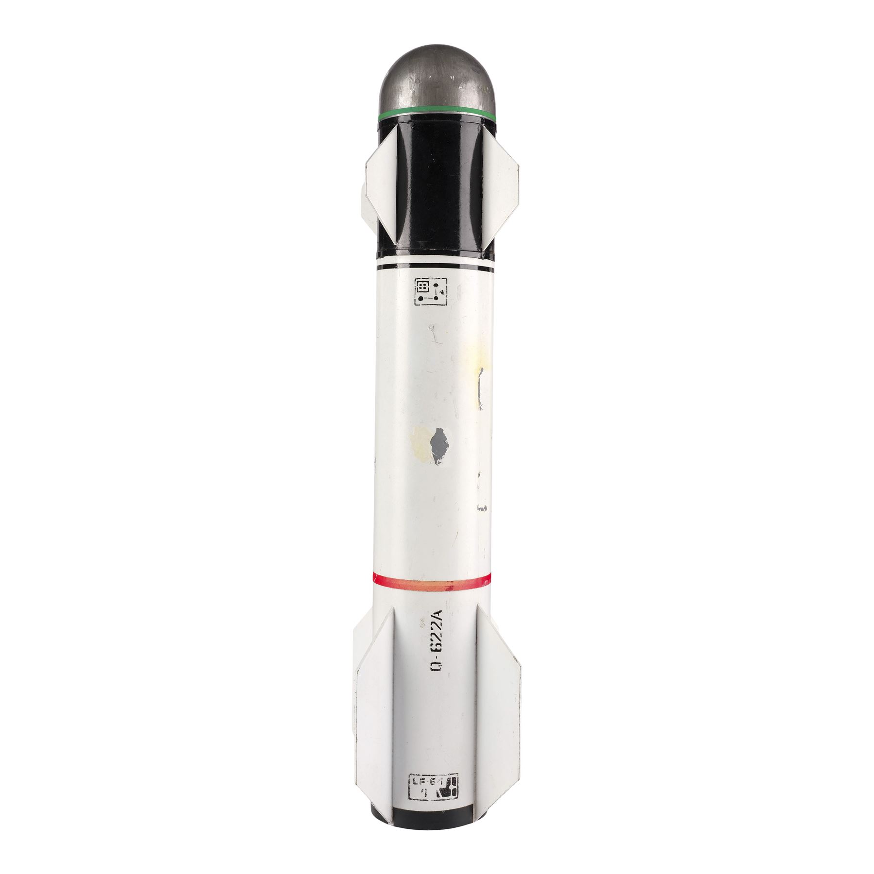 Made from model plastic, this model miniature features a rounded warhead, a set of fins, and a set of wings. It was painted in shades of silver-color, black, and white with one band of green around the warhead, and one band of red around the center hanger. It was also painted with a small control panel and designation "Q-622A." This lot exhibits chipped and flaked paint, yellowed adhesive residue, and discoloration. Dimensions: 19.5" x 3.75" x 3.75" (49.5 cm x 9.5 cm x 9.5 cm)