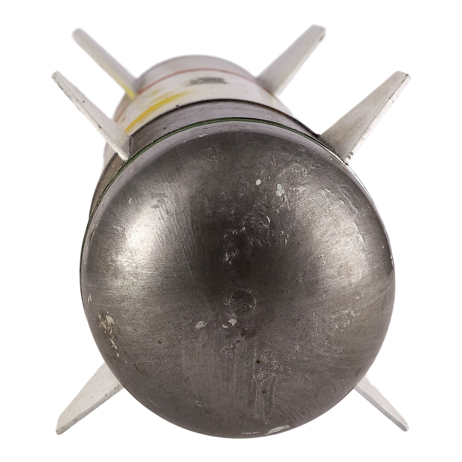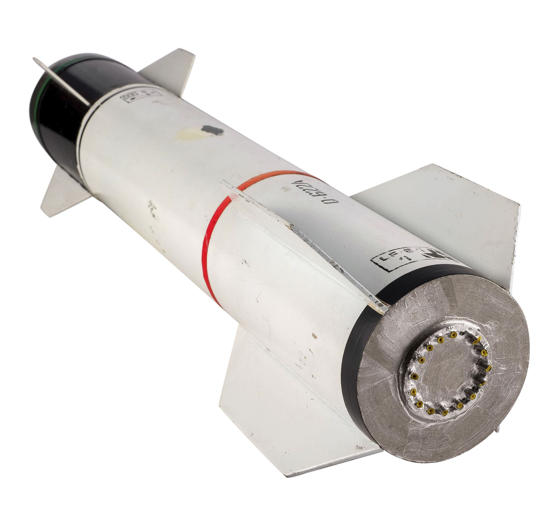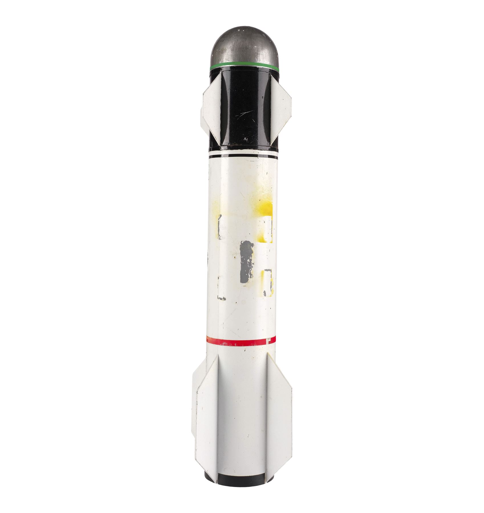 Made from model plastic, this model miniature features a rounded warhead, a set of fins, and a set of wings. It was painted in shades of silver-color, black, and white with one band of green around the warhead, and one band of red around the center hanger. It was also painted with a small control panel and designation "Q-622A." This lot exhibits chipped and flaked paint, yellowed adhesive residue, and discoloration. Dimensions: 19.5" x 3.75" x 3.75" (49.5 cm x 9.5 cm x 9.5 cm)