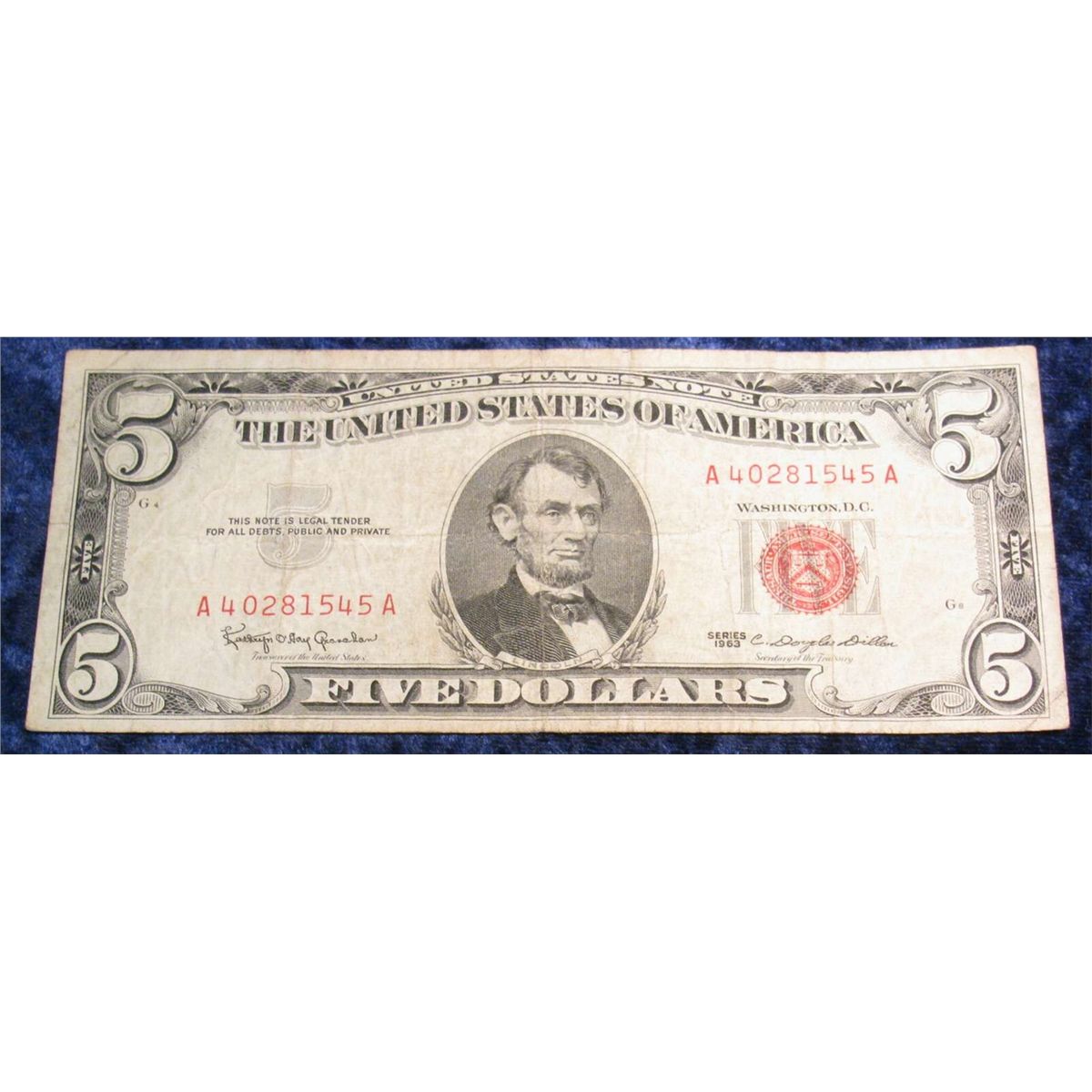 504. Series 1963 $5 U.S. Note. "Red Seal". Fine.