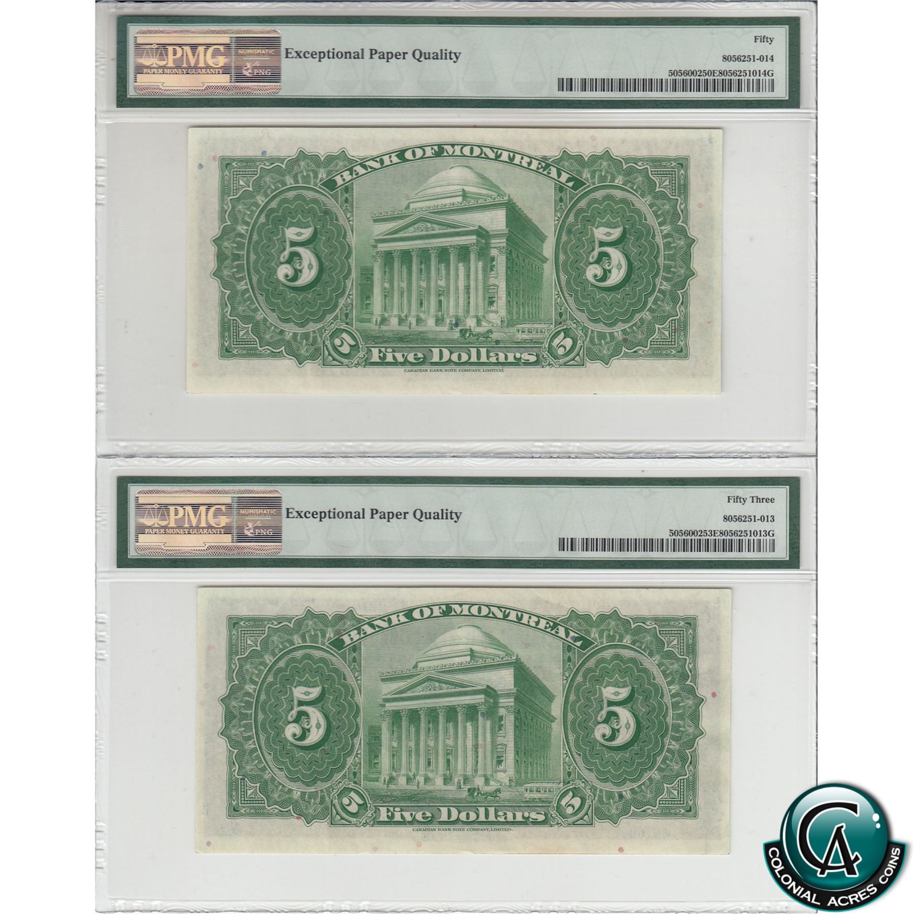 505-60-02 1935 Bank of Montreal $5, 2 in sequence, Bog-Gordon S/N: 1167169/70. Both Notes PMG Certified AU-50 & AU-53 EPQ. (2pcs)