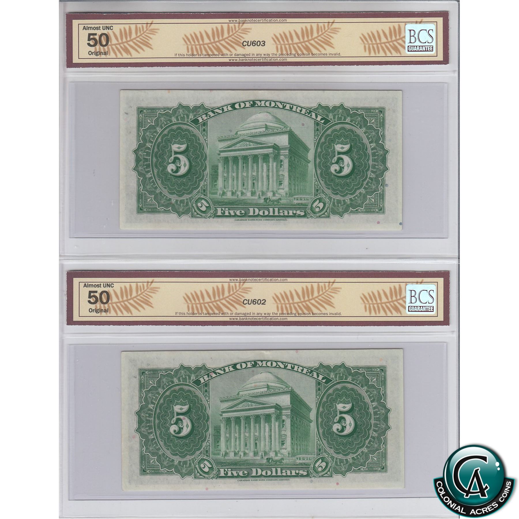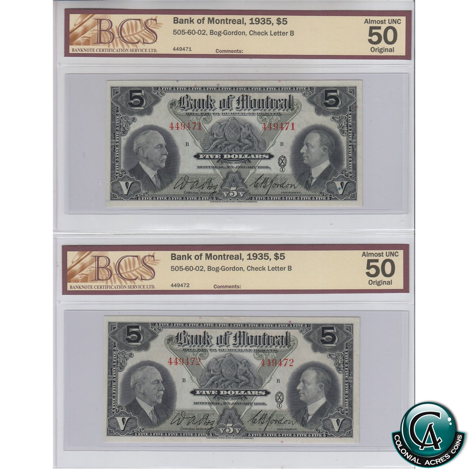 505-60-02 1935 Bank of Montreal $5, 2 in sequence, Bog-Gordon, S/N: 449471/72. Both Notes BCS Certified AU-50 Original. (2pcs)