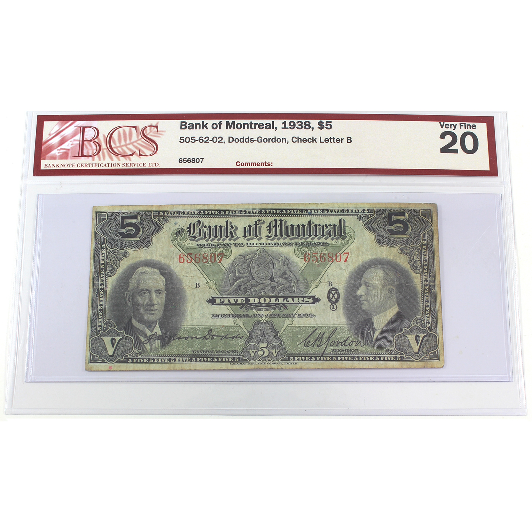 505-62-02 1938 $5 Bank of Montreal BCS VF20 Dodds-Gordon SN: 656807 Check Letter B