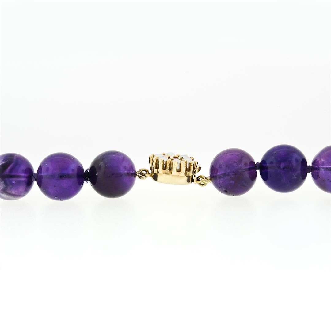 A bead necklace featuring a single strand of 48 round natural amethyst beads (10.88 to 12.43mm - 505ctw) with a solid 14k yellow gold clasp adorned with 6 round bead shaped cultured peals (2.85mm) and 1 old round cut natural ruby (0.15ct). It weighs a total of 106.0 grams, measures 12.4mm wide, and measures 24 inches in length.