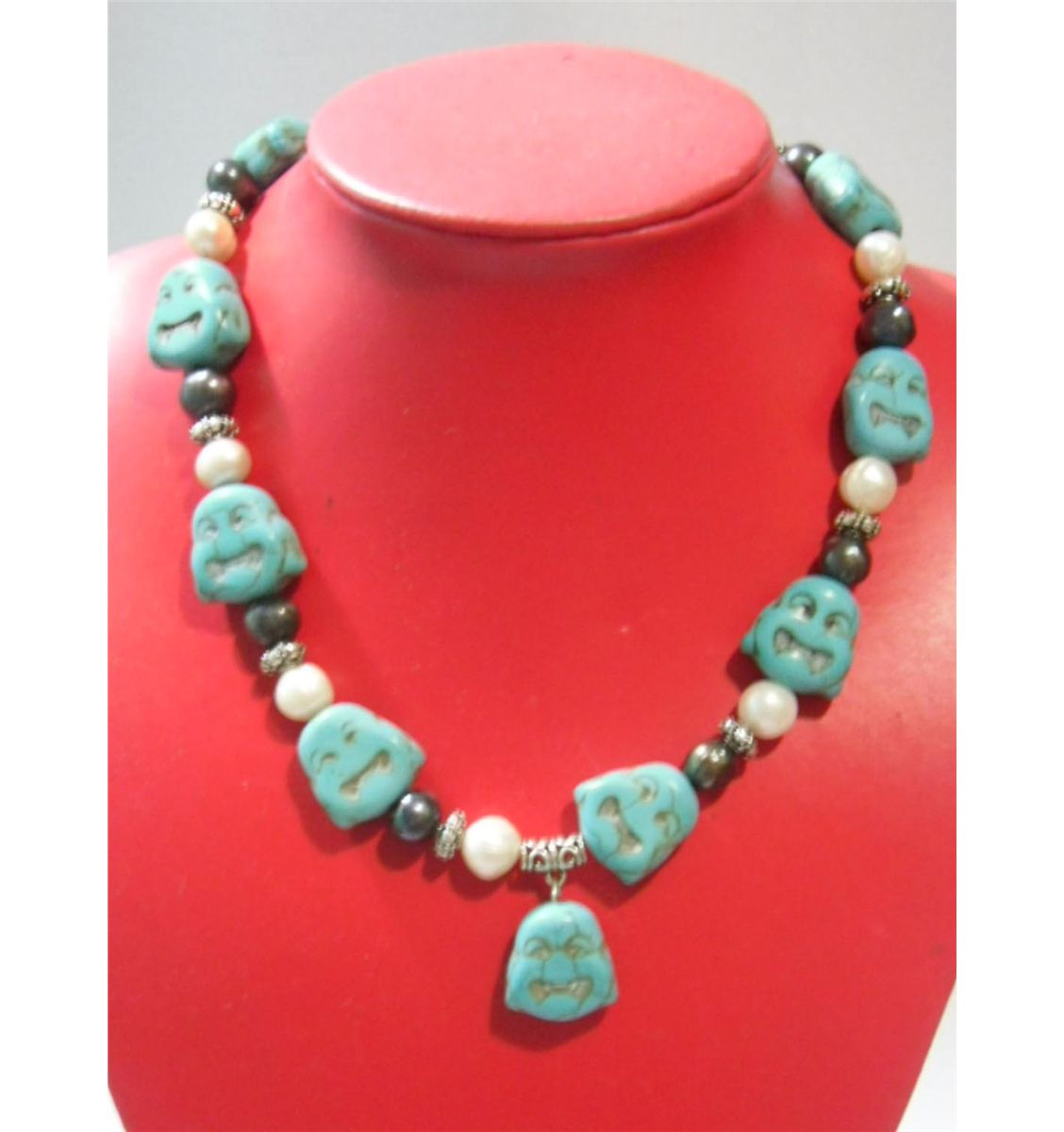 505CTW NATURAL BLUE TURQUOISE BUDDHA AND PHILIPPINE PEA **|**|** 505CTW NATURAL BLUE TURQUOISE BUDDHA AND PHILIPPINE PEARL NECKLACE 18INCH ; MSRP: $0