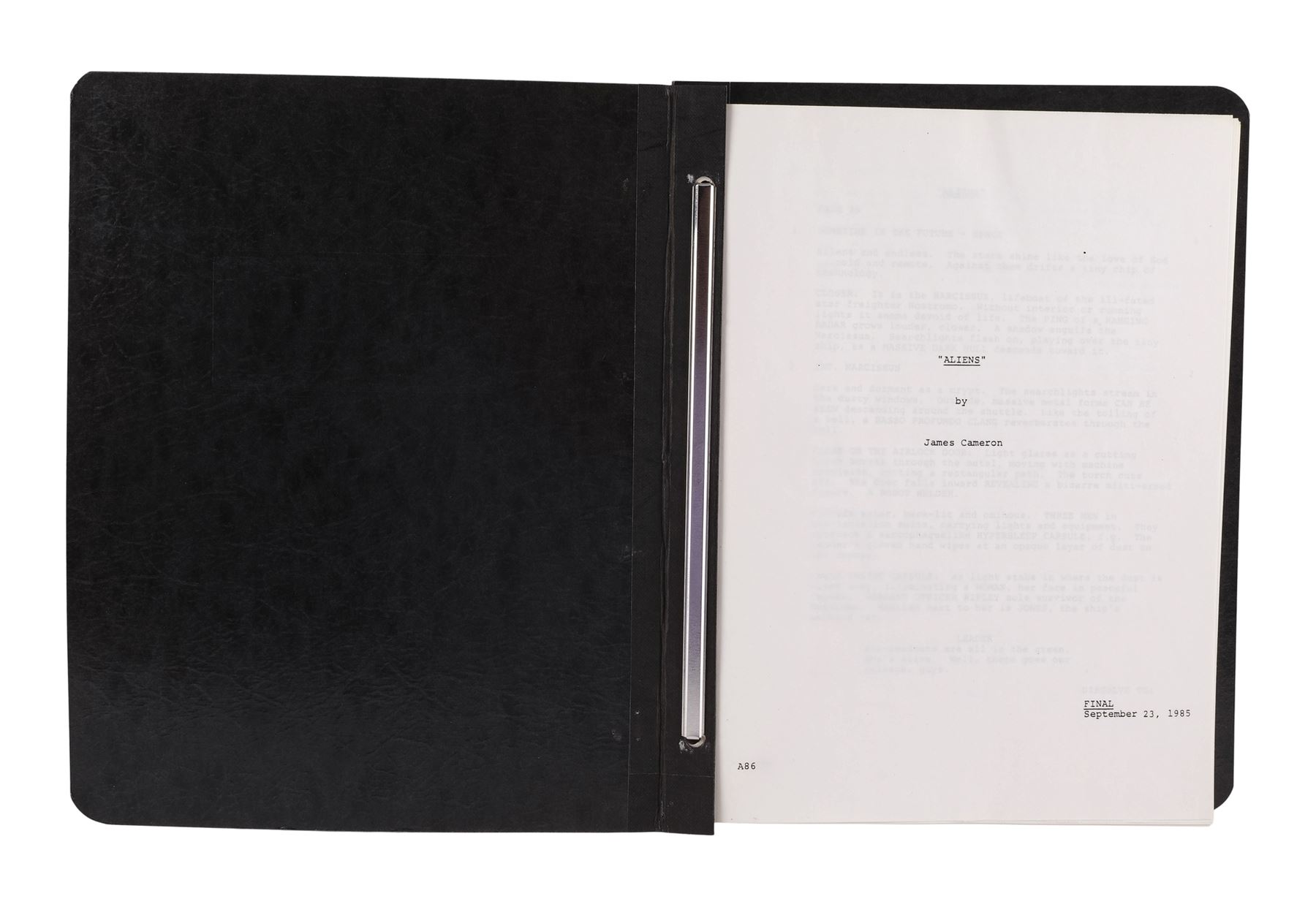 The script is credited to Cameron and is dated "September 23, 1985." It is 106 pages long and bound with metal fasteners between black card covers. The spine of the script is marked "ALIENS" in black ink. This lot exhibits minor scuffing to the cover. Dimensions: 9" x 11.5" x 0.75" (23 cm x 29.25 cm x 2 cm)