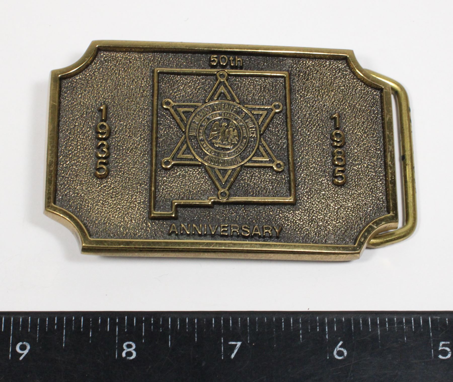 NEW MEXICO SHERIFFS & POLICE ASSOCIATION 1935-1985 50TH ANNIVERSARY BELT BUCKLE, REVERSE MARKED SOLID RASS MADE IN USA.UNITED STATES OF AMERICA POLICE LAW ENFORCEMENT INSIGNIA 1900'S 20TH CENTURY