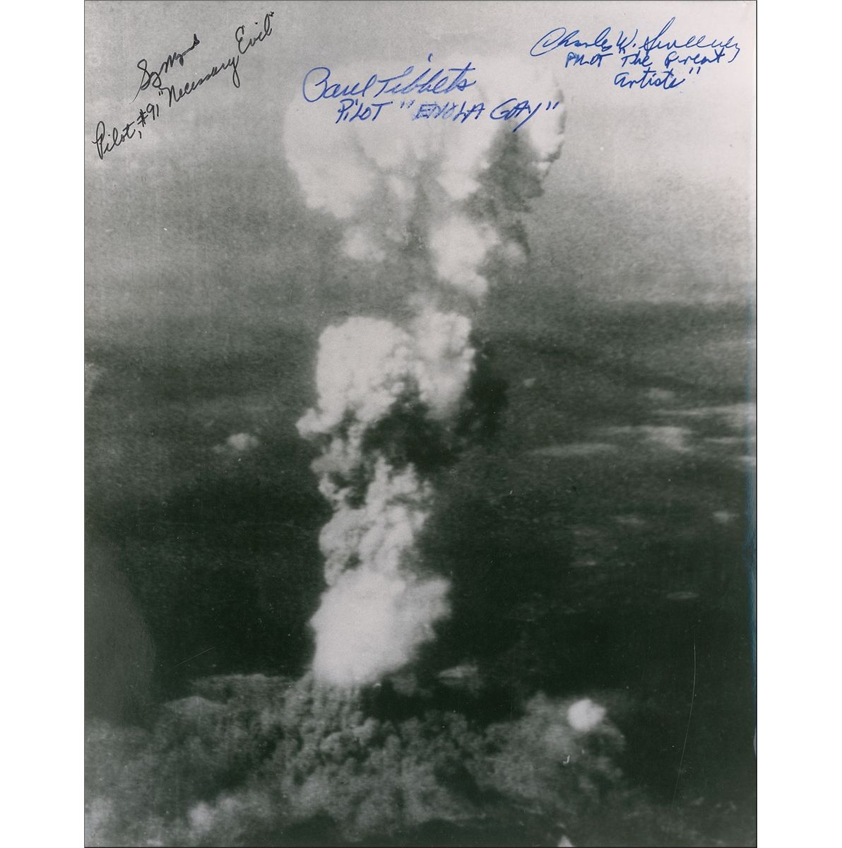 Glossy 8 x 10 photo of the mushroom cloud over Hiroshima, signed in blue felt tip by Paul Tibbets and Charles Sweeney, and signed in black felt tip by George Marquardt. In fine condition, with some mild brushing to Tibbets’ signature.