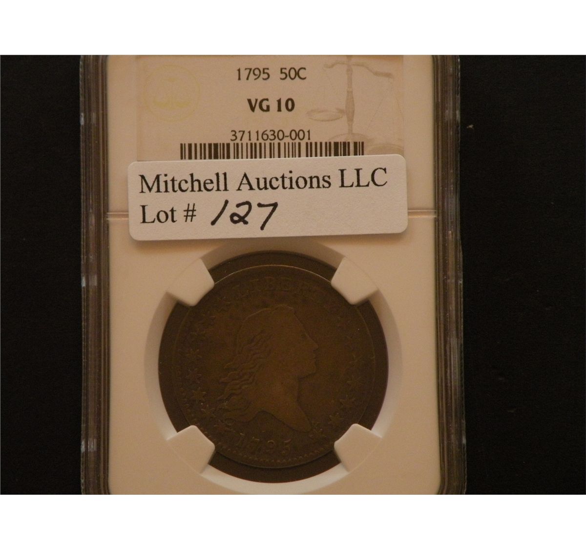 50C 1795 O-119 (R-4). NGC VG 10. Here is a smooth, defect- free, entirely original, medium grey Flowing Hair Half Dollar that clearly is worthy of spirited bidder interest. Est$1800