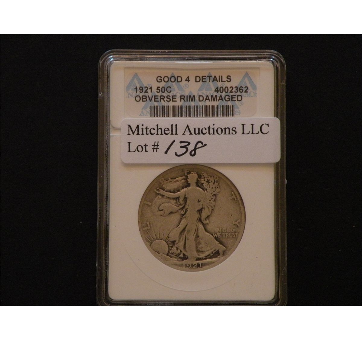 50C 1921 ANACS Good 4 Details, Obverse Rim Damaged. The shallow, tiny rim bruises are largely obscured by the holder. Otherwise smooth, pleasing, and quite scarce. Est$70