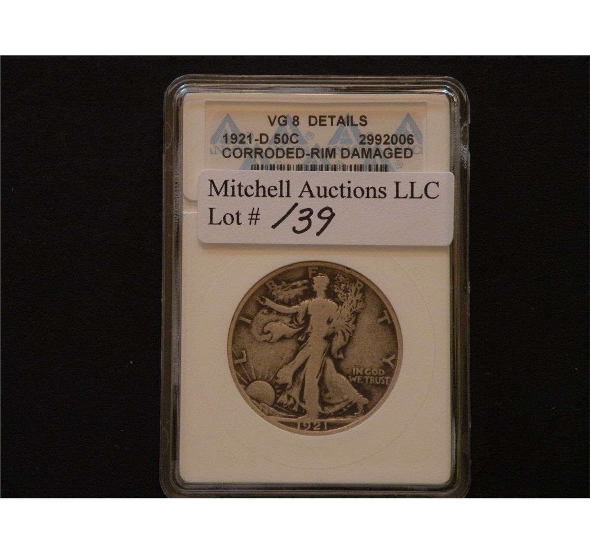 50C 1921- D ANACS VG8 Details, Corroded- Rim Damaged. The presentation is surely much better than the ANACS qualifiers make it sound. The key date to this series, and a chance to fill a hole in your collection in an affordable yet aesthetically pleasing way. Est$150