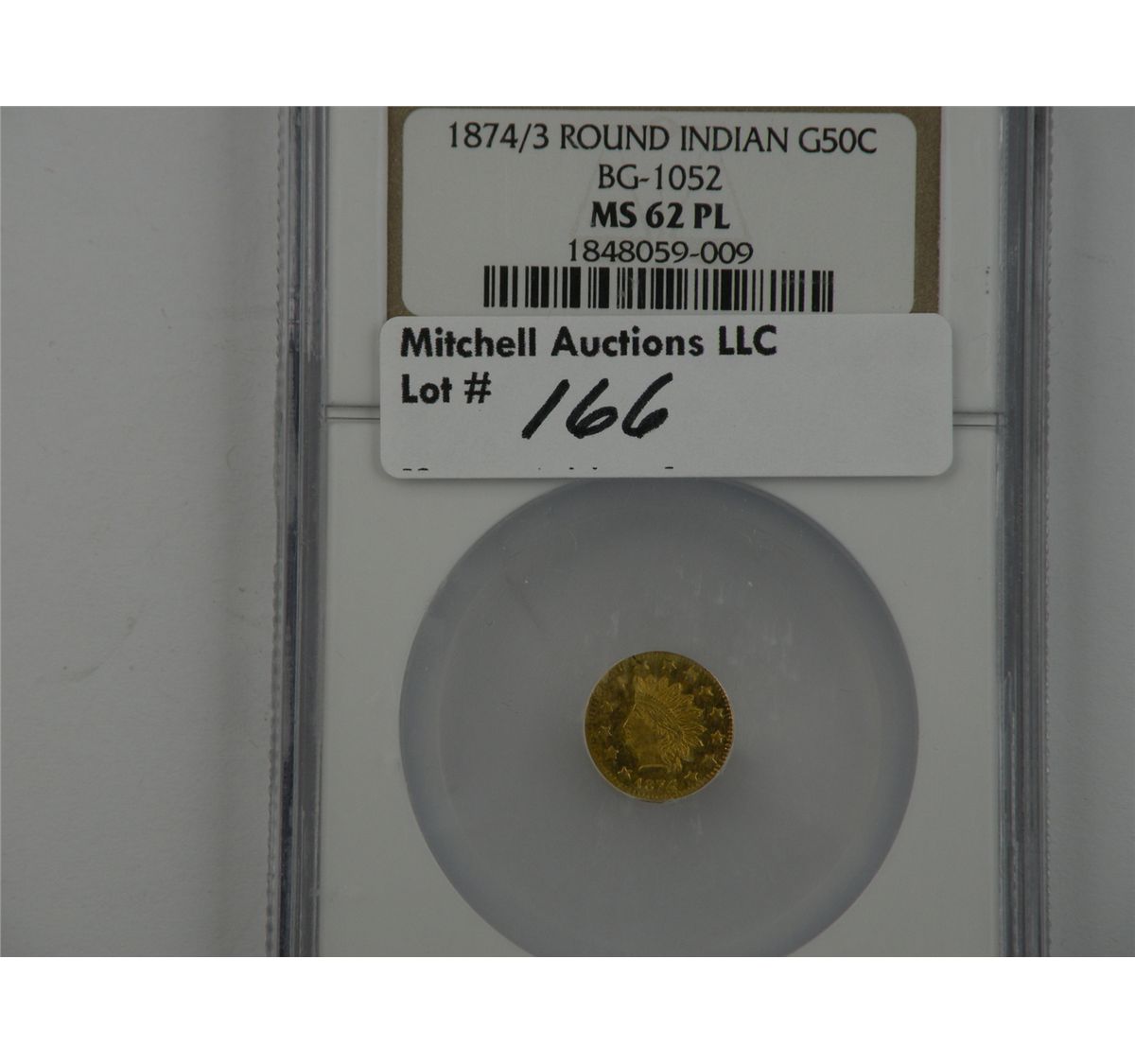 50C California Fractional Gold. 1874/3 Round Indian. BG-1052. NGC MS62PL. Scarce, historic, and highly collectible. Est.$425