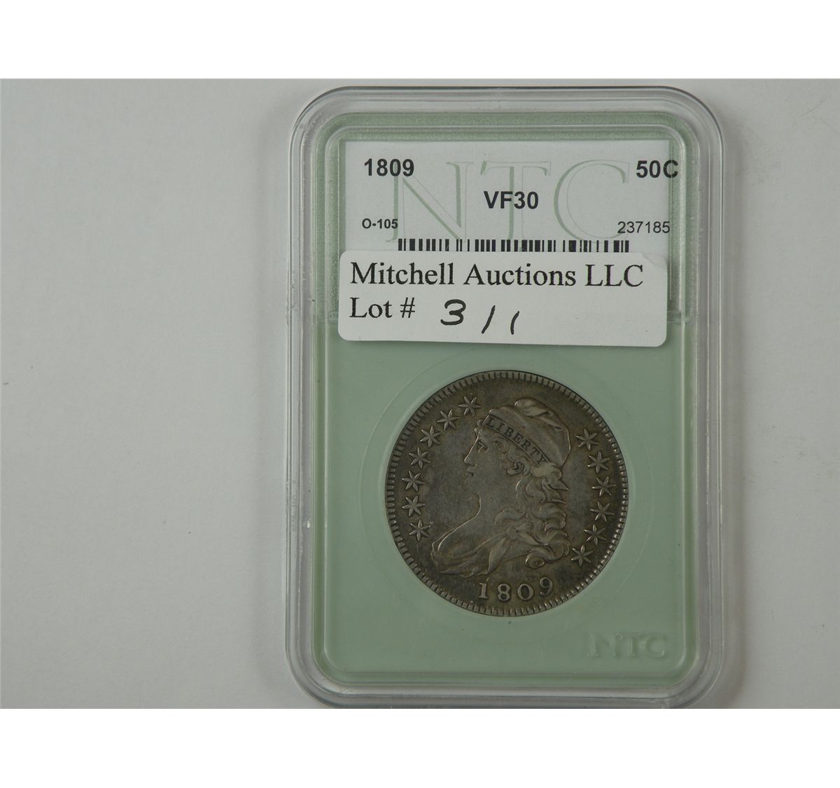 50c 1809 O-105. NTC VF30 and quite pleasing for the assigned grade. Balanced surfaces show a bit of softness at the Eagle's left wing. Trivial reverse rim bruises hardly detract and are mentioned for accuracy. Scarce. Est.$225