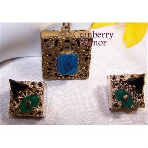 * out of the 50s comes to you this highly ornate Demi Parure by Kafin - golden filigree boxes are decorated w/variety of faux stones in a variety of settings - lending to an extremely decorative, and nostalgic, set