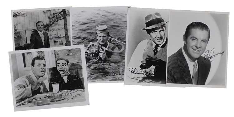 Five photos, four 8 x 10 and one 10 x 8, each signed by the respective star pictured. Signers are: Danny Thomas, Paul Winchell, Lloyd Bridges, Robert Stack, and Bob Cummings. In fine overall condition. RRAuction COA.