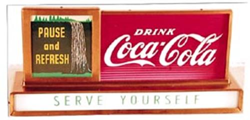 Bottom glass panel says "serve yourself". This is a wonderfully clean and bright example. Appears to be all original with great glasses, lights up, works and runs well. Much less than avg. wear on the gold toned surfaces. Only light soiling. Cond. 8.0-8.5.