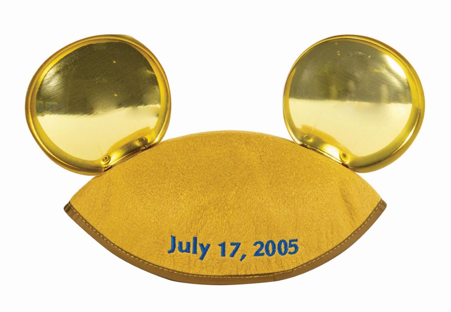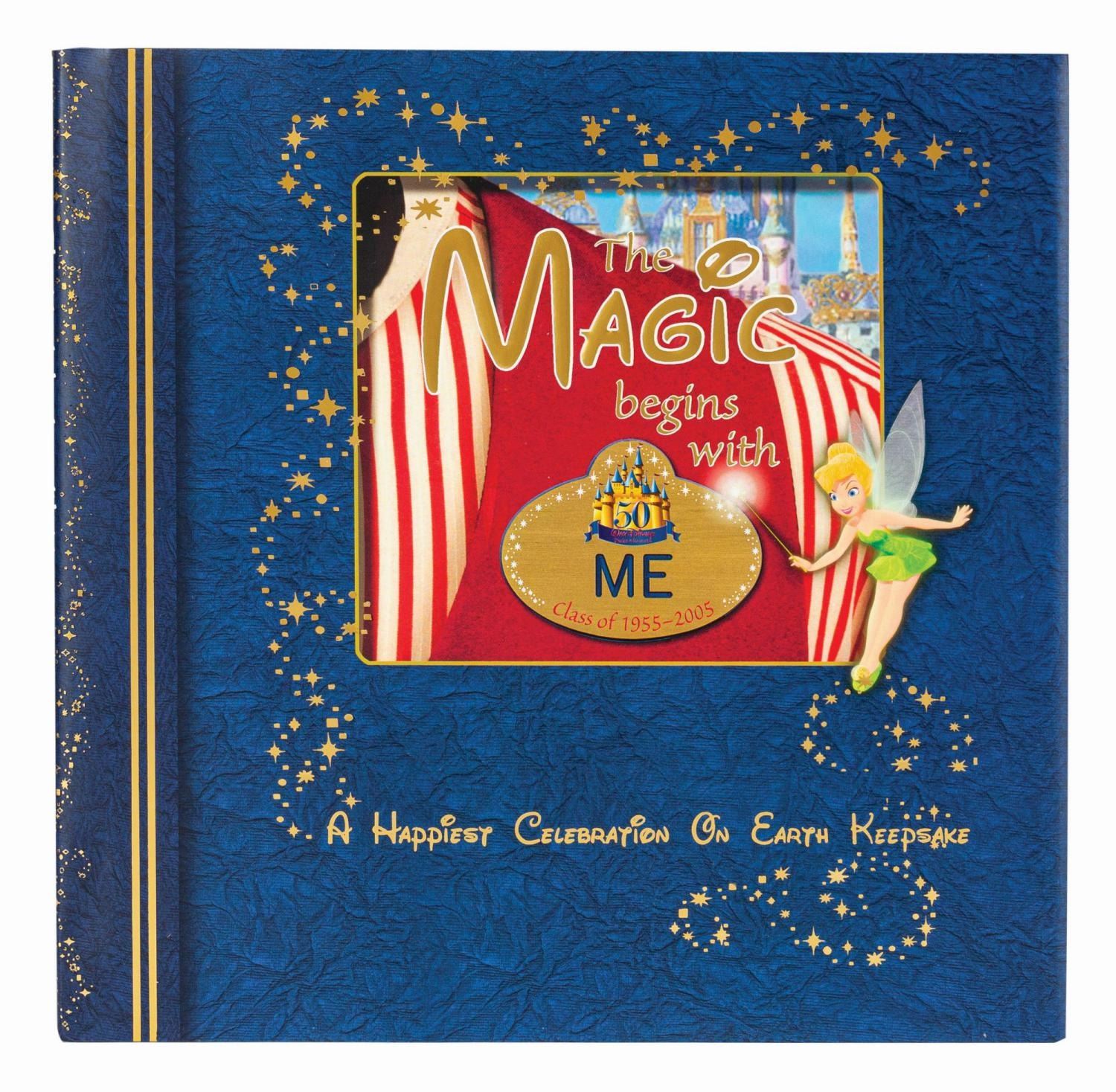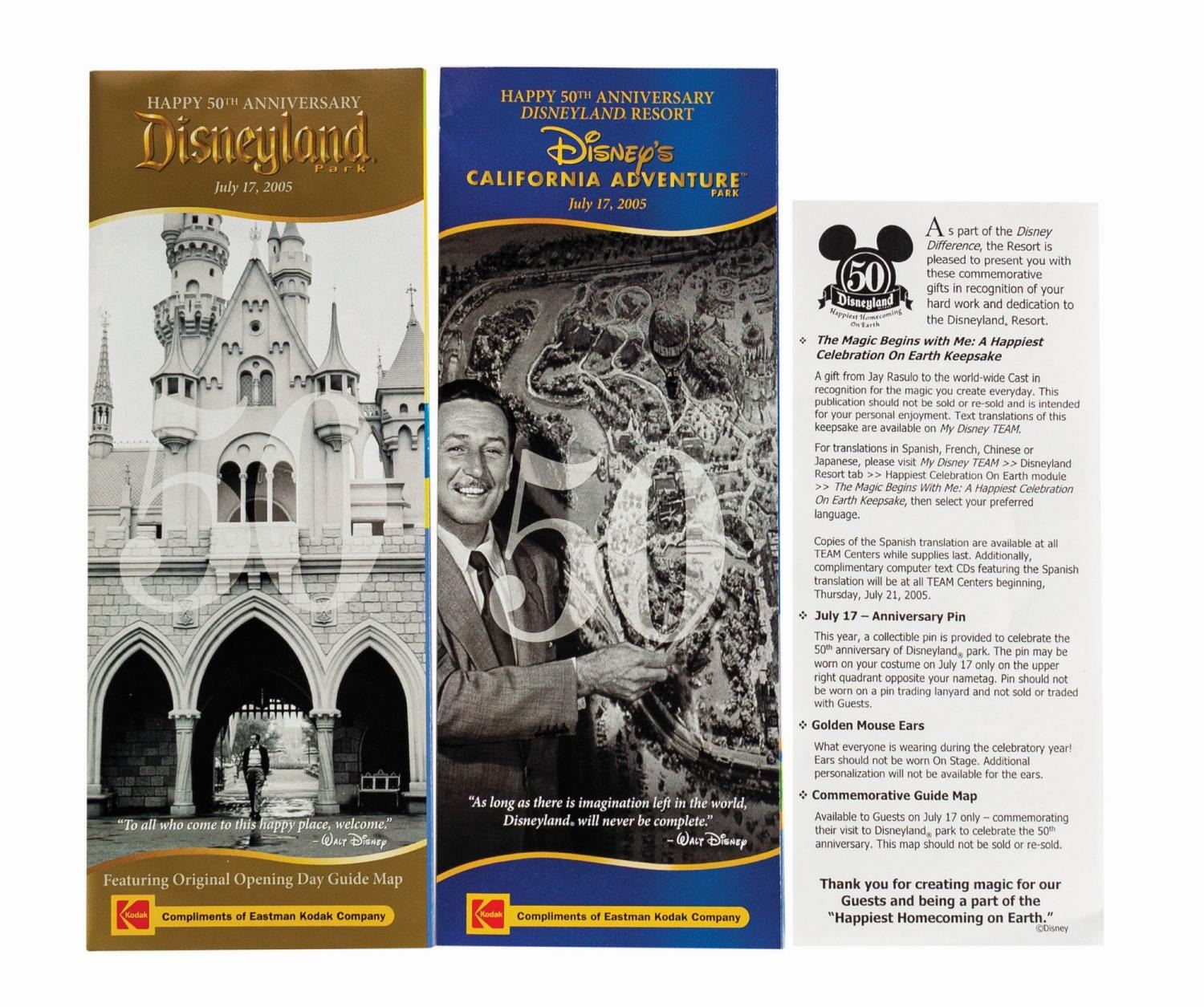 (Disneyland, 2005) A complete set of Disneyland 50th anniversary cast member gifts. The set includes a special "I Worked There July 17, 2005" enamel pin, a 50th anniversary park map brochure, a July 17, 2005 issue of the cast-exclusive magazine Disneyland Resort Line numbered "164/18,000," a 50 Happiest Moments on Earth cast-exclusive complete (50) trading card set, a cast-member exclusive hardcover book titled The Magic Begins with Me, and a pair of golden ears with a Disneyland 50th patch. All items are assembled in the original Disneyland 50th anniversary branded plastic shopping bag. The bag measures 14"x17" and 2.25" deep. Overall, the set is in very good condition. A few pieces exhibit corner and edge wear, minor denting, or general handling.