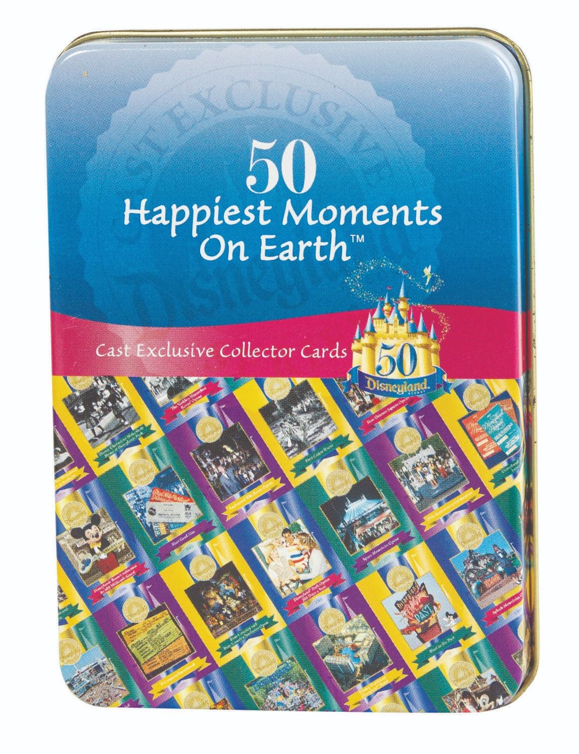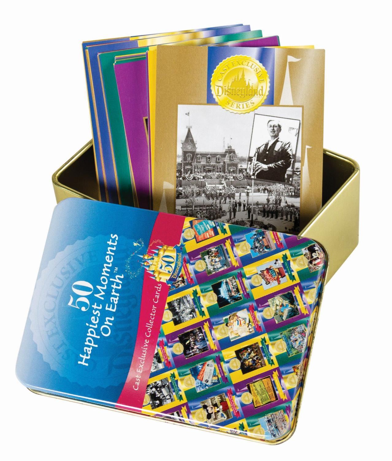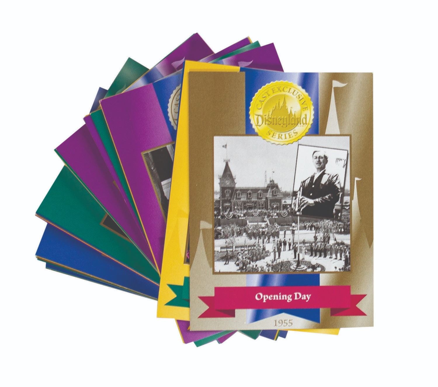 (Disneyland, 2005) A complete set of Disneyland 50th anniversary cast member gifts. The set includes a special "I Worked There July 17, 2005" enamel pin, a 50th anniversary park map brochure, a July 17, 2005 issue of the cast-exclusive magazine Disneyland Resort Line numbered "164/18,000," a 50 Happiest Moments on Earth cast-exclusive complete (50) trading card set, a cast-member exclusive hardcover book titled The Magic Begins with Me, and a pair of golden ears with a Disneyland 50th patch. All items are assembled in the original Disneyland 50th anniversary branded plastic shopping bag. The bag measures 14"x17" and 2.25" deep. Overall, the set is in very good condition. A few pieces exhibit corner and edge wear, minor denting, or general handling.