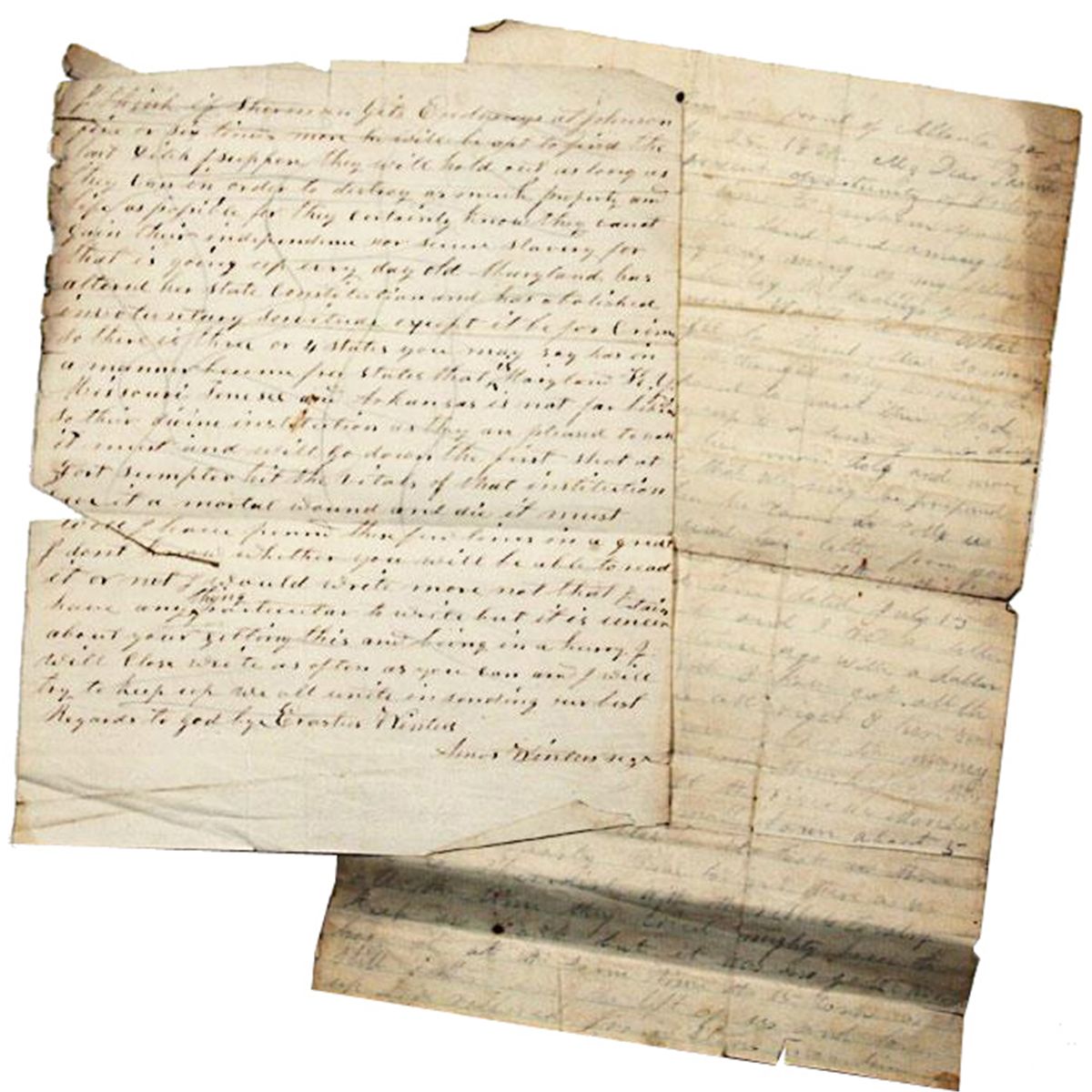 Civil War letter from Erastus Winters of the 50th Ohio Infantry, Company K, captured and then wounded in the Sultana disaster. Written in pencil and dated 25 July 1864, Winters writes during the Siege of Atlanta: ''…Many, very many of my fellow beings have gone to try the realities of another and unseen world…we had to skirmish with the rebel's cavalry all the time, they tried mighty hard to keep us back,the next morning at daylight we advanced and occupied their works. The rebels then massed all their force in front of the 15, 16 and 17th Corps and charged them and drove them back and for a while the fortunes of the day went against us,they flanked our forces and turned our left as far back as Decatur…finally our forces rallied and drove them back having an open field fight with them, their loss is said to be 8,000 ours 5,000…we wounded and captured Hardee and killed Cheatham and we lost McPherson…we have now moved up to about three-quarters of a mile from their works, they are strongly fortifying right close around the city…one shell struck Thomas Sherman, killed him and struck Henry Hall and cut his leg off below the knee'' Winters mustered into Company K on 24 August 1862 and mustered out as a Corporal on 20 May 1865. He was taken prisoner in November 1864 at the Battle of Franklin, but exchanged the following spring. On his way home he was picked up at Vicksburg by the steamer Sultana, which sank when its boiler exploded on 27 April 1865. About 1,700 of the overloaded ship, 2,400 passengers died in what remains the worst maritime disaster in U.S. history. Winters suffered burns and spent weeks in a Memphis hospital, but survived. 2pp. letter shows minor wear and tears not affecting readability. Good condition.