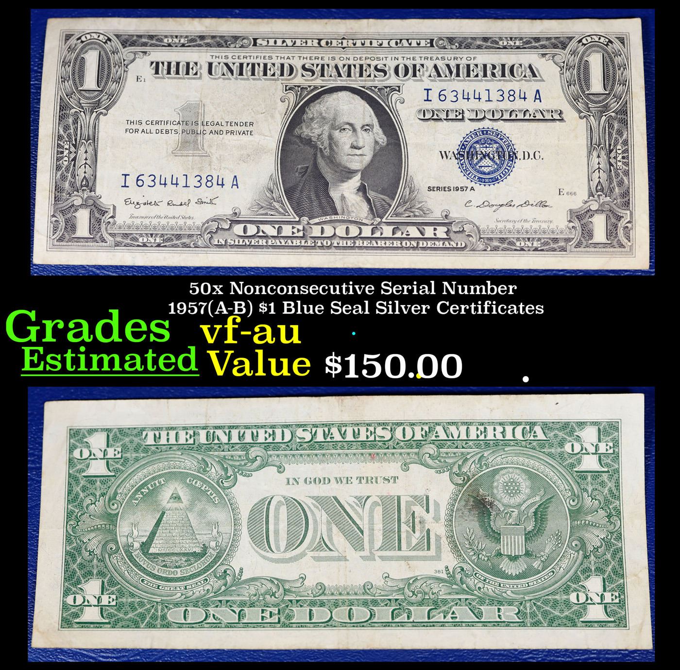 50x Nonconsecutive Serial Number 1957(A-B) $1 Blue Seal Silver Certificates Grades vf-au.
