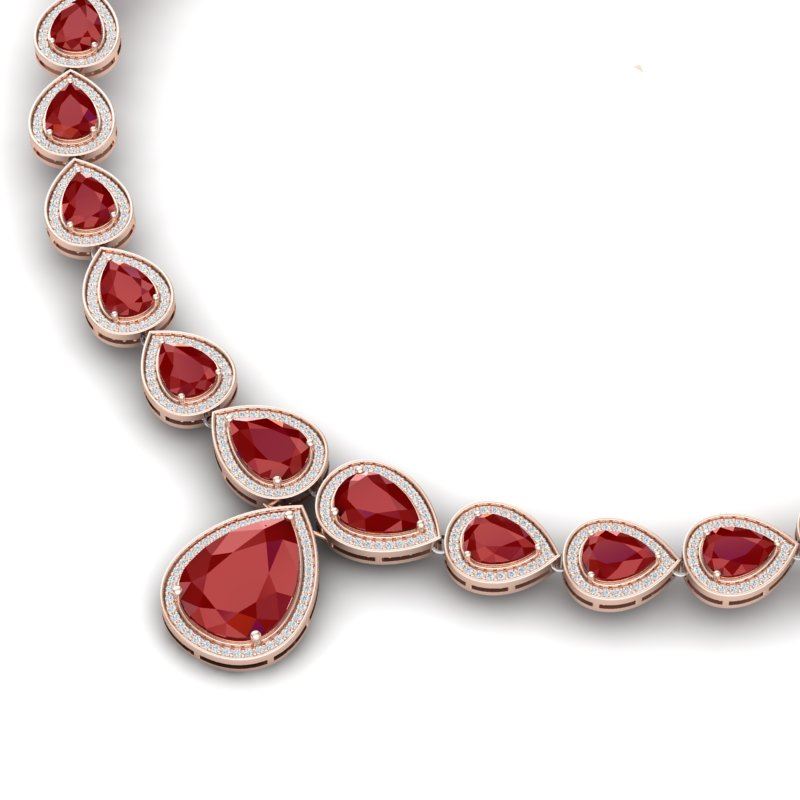 51.41 CTW Royalty Ruby & VS Diamond Necklace 18K Rose Gold ---- Luxury Designer Brand Necklace Appraised Retail Price at $84,000 ---- SKU Number US39424 18K Rose gold Necklace Size is 16 Inches, Can custom fit length, Necklace measuring approx. 4 3/4 x 1 1/4 Inches, weighing in total approx. 40 grams. Made in the USA and is stamped 18K, Main stone 10.71 carat total weight containing 1 pieces of Intense Mid-Opaque Red color with AAA quality Pear shape cut Ruby , Stone #2 34.58 carat total weight containing 18 pieces of Intense Mid-Opaque Red color with AAA quality Pear shape cut